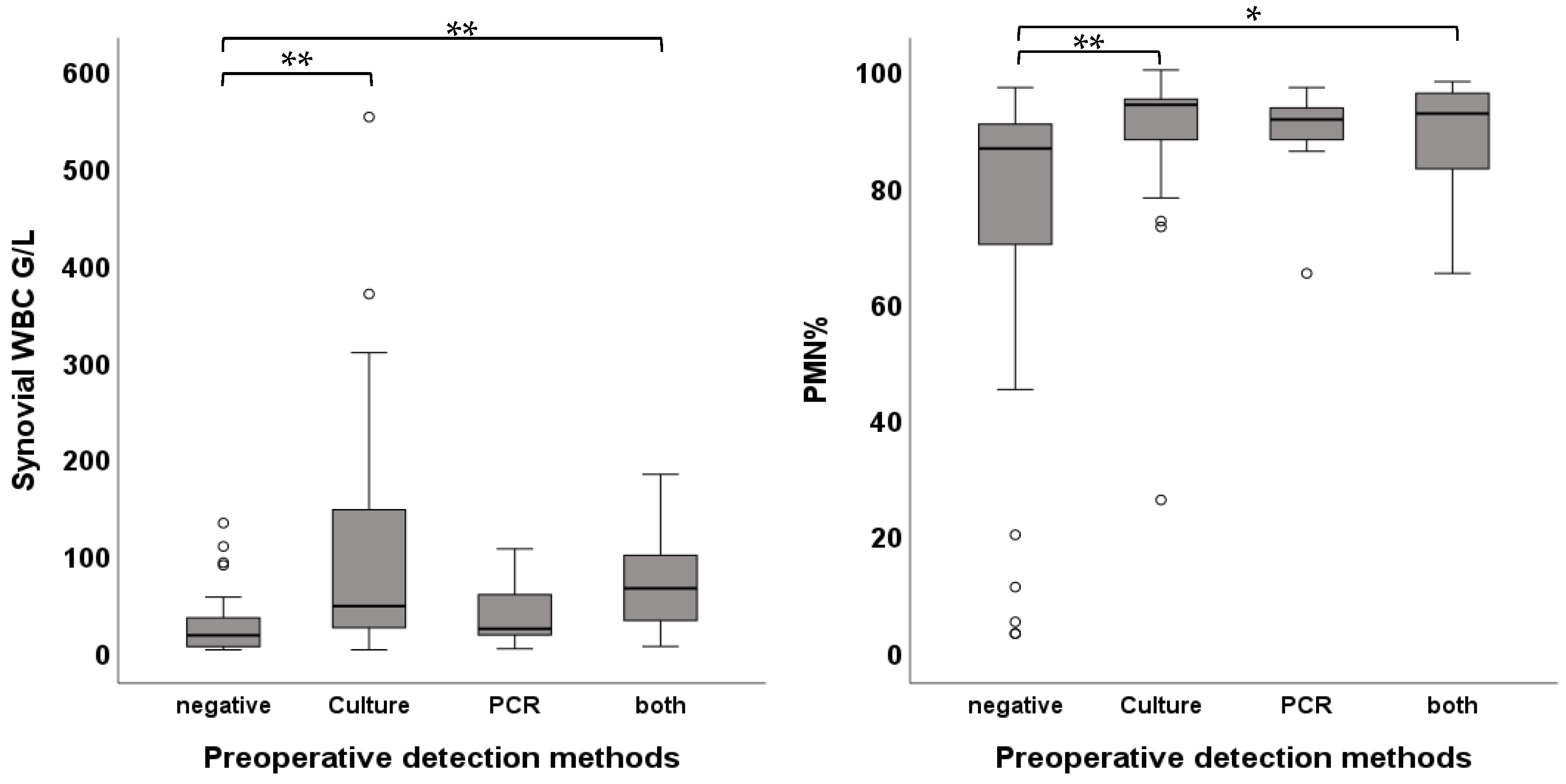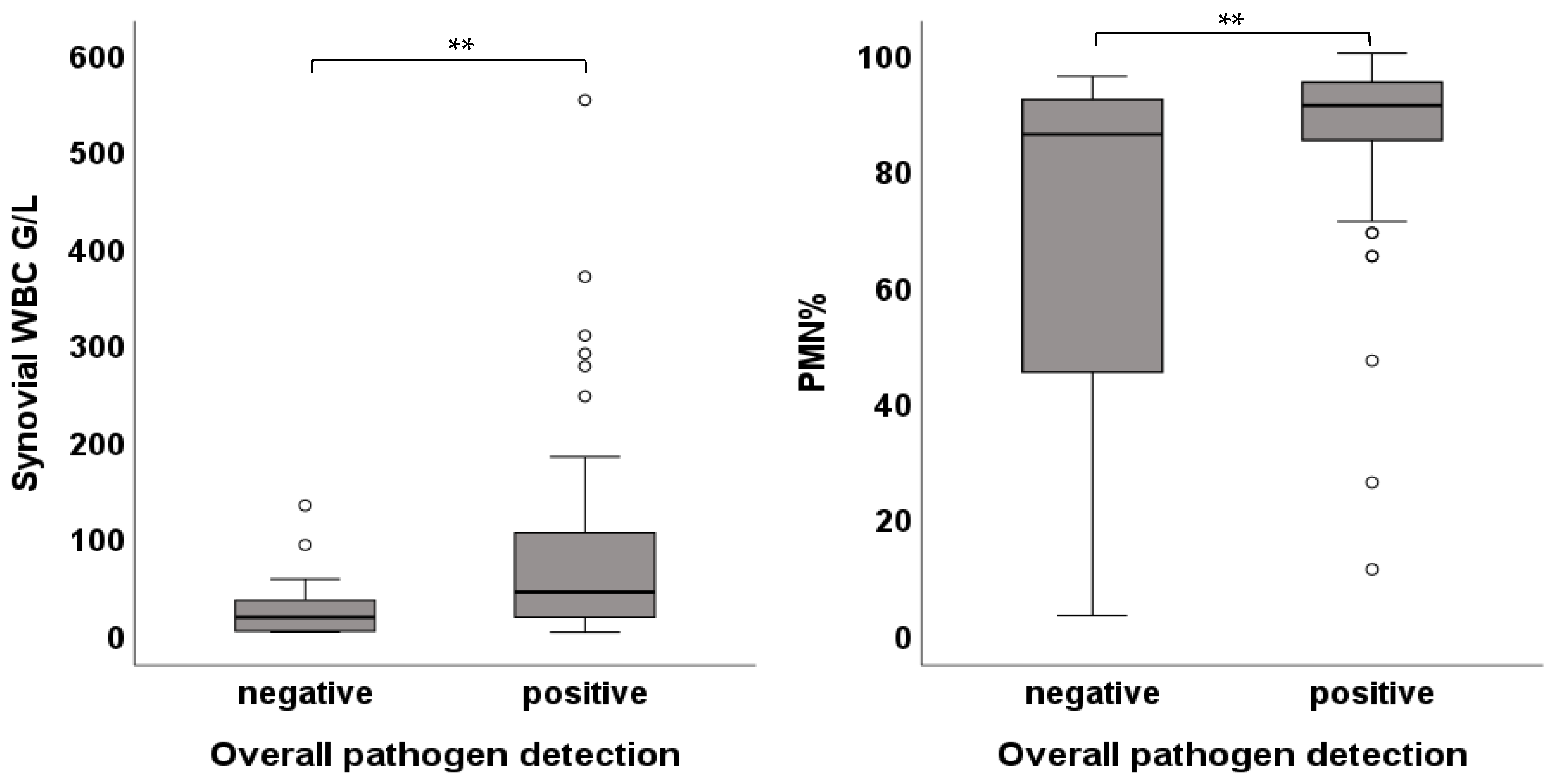 - Morgenstern, C.; Cabric, S.; Perka, C.; Trampuz, A.; Renz, N. Synovial fluid multiplex PCR is superior to culture for detection of low-virulent pathogens causing periprosthetic joint infection. Diagn. Microbiol. Infect. Dis. 2018, 90, 115–119. [Google Scholar] [CrossRef]