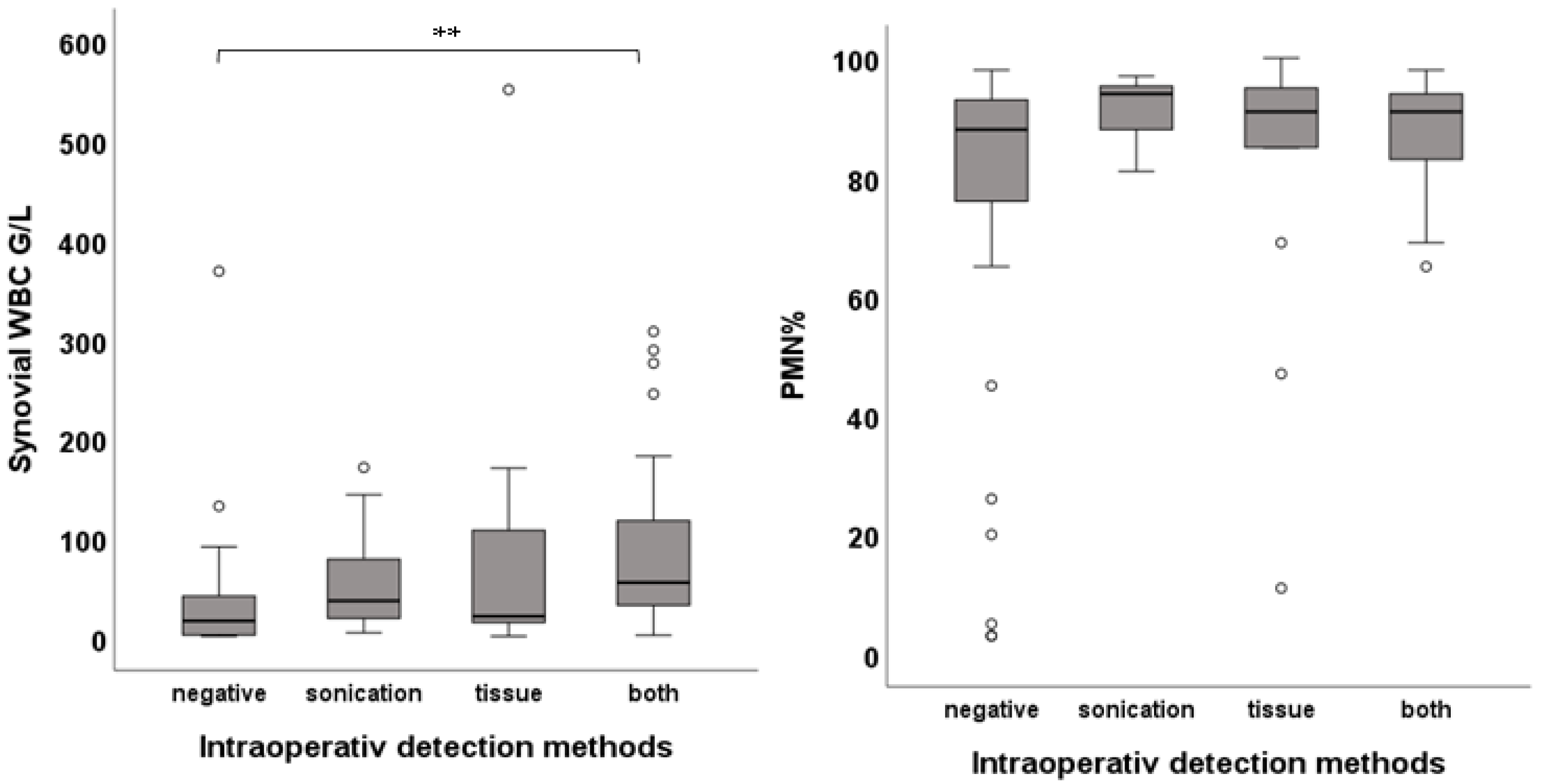 - Tani, S.; Lepetsos, P.; Stylianakis, A.; Vlamis, J.; Birbas, K.; Kaklamanos, I. Superiority of the sonication method against conventional periprosthetic tissue cultures for diagnosis of prosthetic joint infections. Eur. J. Orthop. Surg. Traumatol. 2018, 28, 51–57. [Google Scholar] [CrossRef]