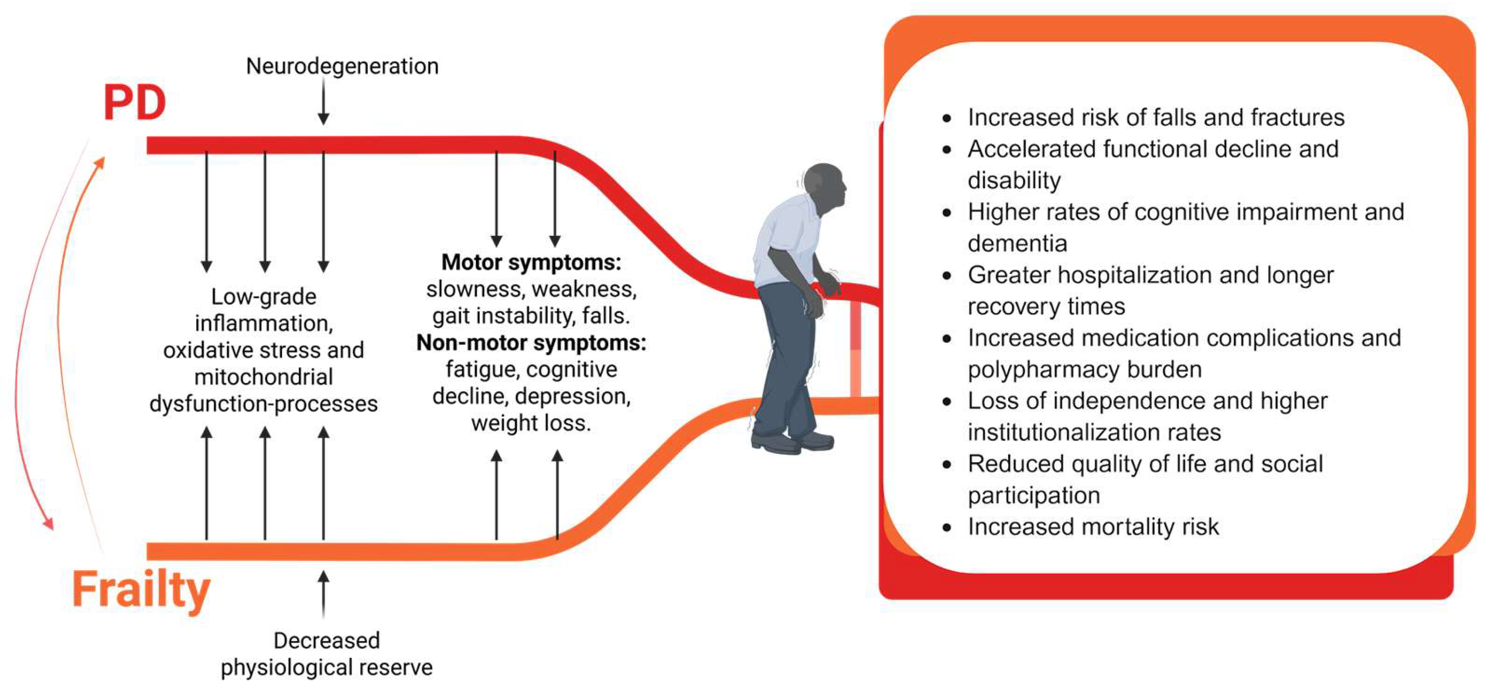 Frailty and PD frequently coexist, sharing pathophysiological foundations rooted in biological aging and cellular stress [