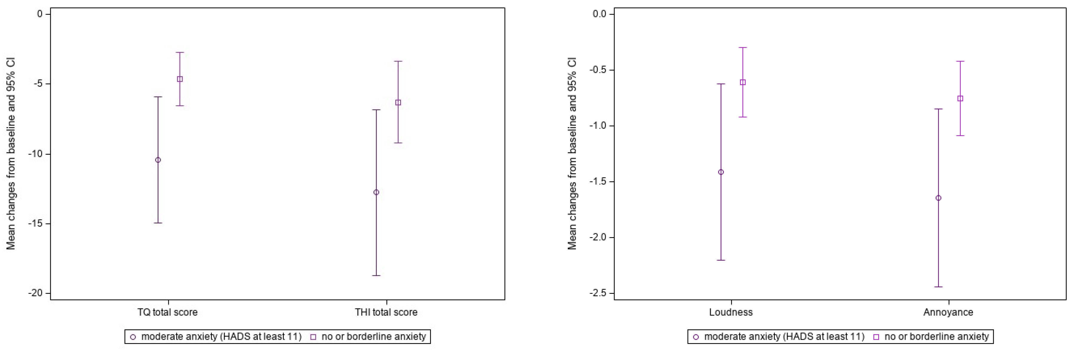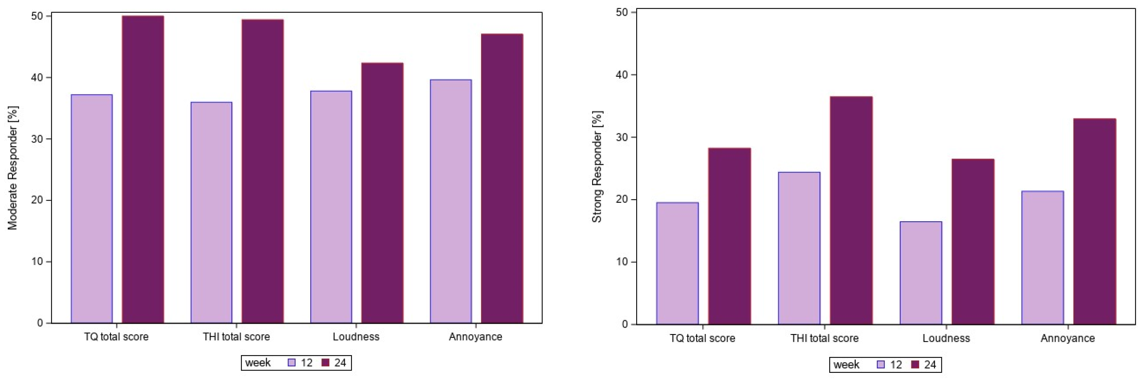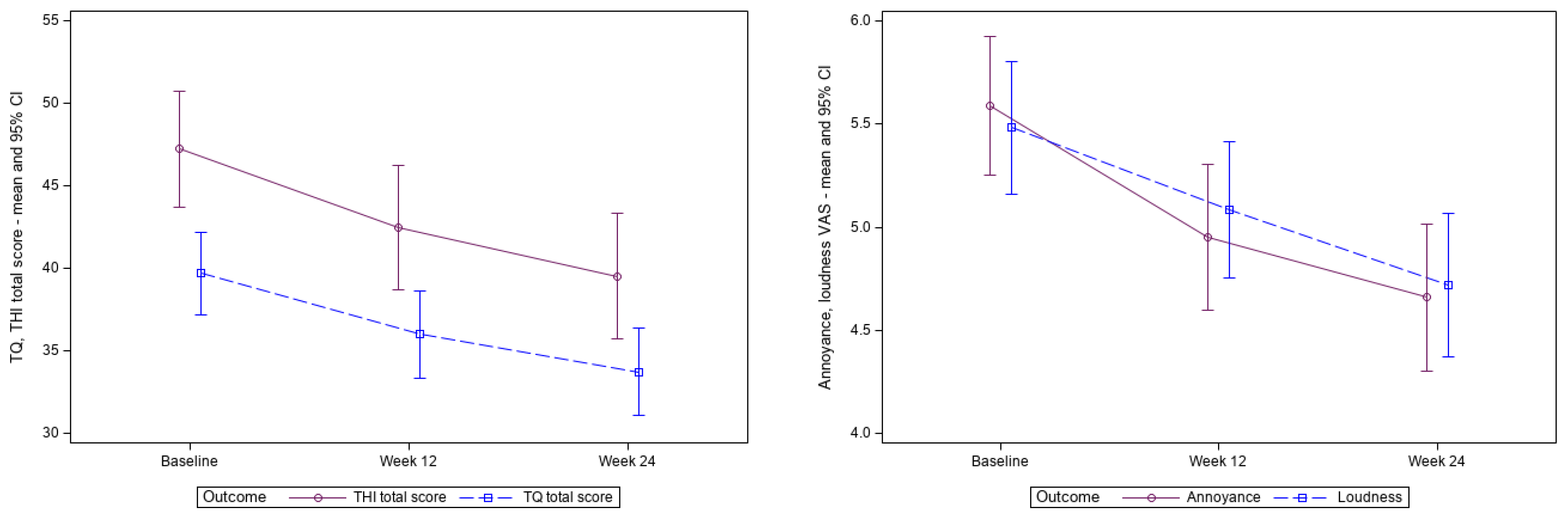 | THI (points) | 66.5 ± 19.4 | −12.8 ± 17.0, p = 0.0001 | 42.3 ± 22.2 | −6.3 ± 17.3, p < 0.0001 | 0.0536 |