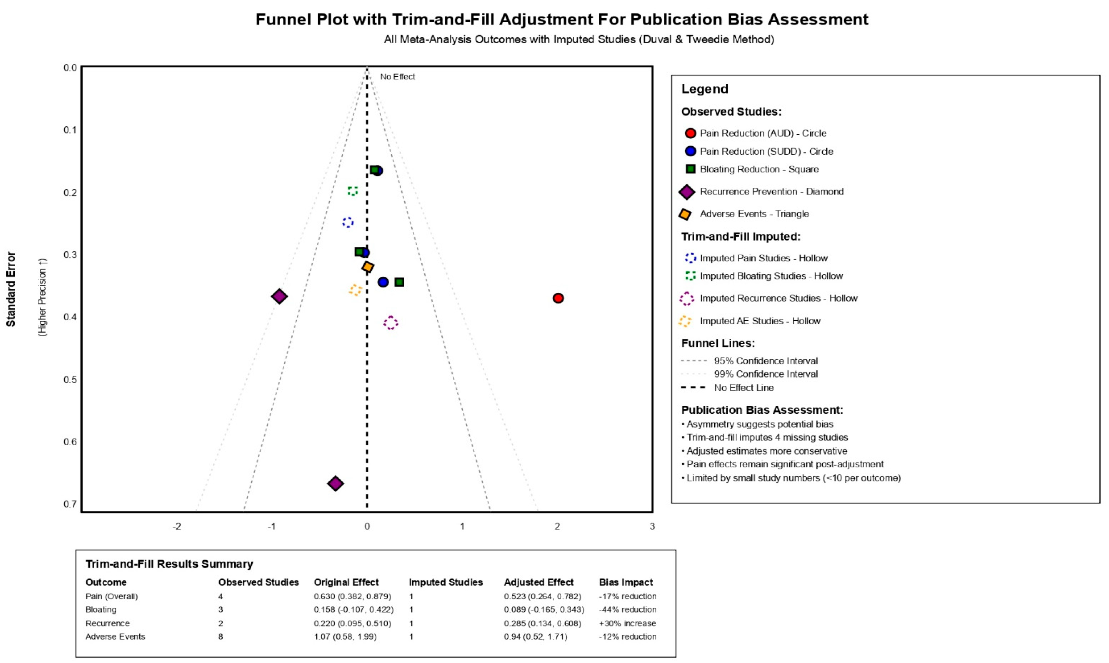 | ALL RCTs OVERALL | Meta-analysis | 4 studies with complete pain data, 3 with bloating data | - | - | - | - | - | 0.630 (0.382, 0.879) | 0.158 (−0.107, 0.422) | Medium effect for pain, high heterogeneity |
