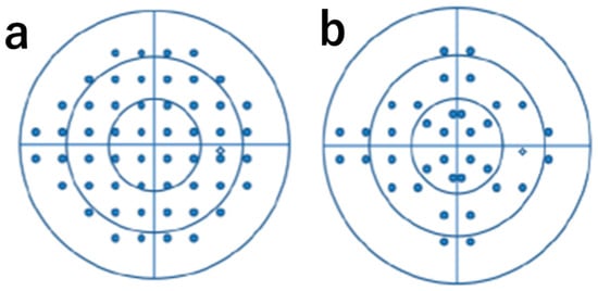 In both cases, asymmetric central scotomas were seen using the 24-2 but not using 24plus(1). Since 24plus(1) has a different spatial arrangement of test points within the central 10°, a smaller consciously perceived circular area could lead to more localized scotomas compared with the 24-2. Since determining which eye could perceive a light stimulus under binocular open-view testing was difficult [15,16], atypical right-eye scotomas observed with 24plus(1) are thought to result from differences in the size of the perceived circular area, rather than from the test configuration or knowledge. Consequently, these factors might explain why the central scotomas showed lower agreement rates compared with concentric constrictions.