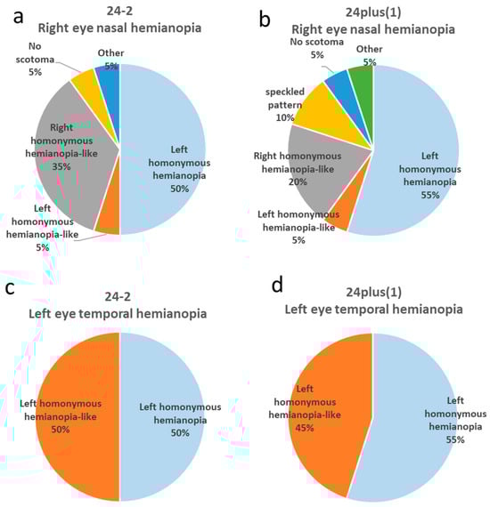 Distribution of phenotypic patterns in right nasal hemianopia and left temporal hemianopia created under 24-2 and 24plus(1) testing modes. (a) Phenotypic distribution of intentionally created right nasal hemianopia measured by 24-2. The most frequent pattern was left homonymous hemianopia (50%), followed by right homonymous hemianopia-like (35%). (b) Phenotypic distribution of intentionally created right nasal hemianopia measured by 24plus(1). The most frequent pattern was left homonymous hemianopia (55%), followed by right homonymous hemianopia-like (20%). (c) Phenotypic distribution of intentionally created left temporal hemianopia measured by 24-2. Both left homonymous hemianopia and left homonymous hemianopia-like patterns accounted for 50% each. (d) Phenotypic distribution of intentionally created left temporal hemianopia measured by 24plus(1). The most frequent pattern was left homonymous hemianopia (55%), followed by left homonymous hemianopia-like (45%).