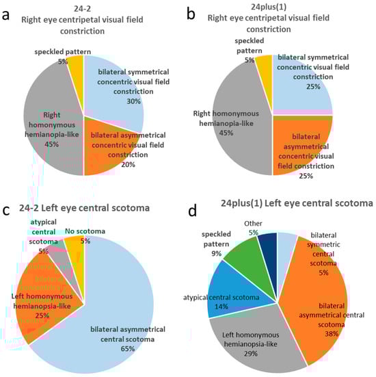 Distribution of phenotypic patterns in right centripetal visual field constriction and left central scotoma under 24-2 and 24plus(1) testing modes. (a) Phenotypic distribution of intentionally created right centripetal visual field constriction measured by 24-2. The most frequent pattern was right homonymous hemianopia (45%), followed by symmetrical (30%) and asymmetrical (20%) centripetal constriction. (b) Phenotypic distribution of intentionally created right centripetal visual field constriction measured by 24plus(1). The most frequent pattern was right homonymous hemianopia-like (45%), followed by symmetrical and asymmetrical centripetal constriction (25% each). (c) Phenotypic distribution of intentionally created left central scotoma measured by 24-2. The most frequent pattern was asymmetrical central scotoma (65%), followed by left homonymous hemianopia-like (25%). (d) Phenotypic distribution of intentionally created left central scotoma measured by 24plus(1). The most frequent pattern was asymmetrical central scotoma (38%), followed by left homonymous hemianopia-like (29%).