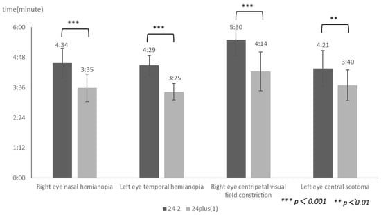 As shown in Figure 6, the mean test durations were 274 ± 35 s, 269 ± 22 s, 330 ± 39 s, and 261 ± 42 s for right eye nasal hemianopia, left eye temporal hemianopia, right eye concentric visual field constriction, and left eye central scotoma, respectively, when measured using the 24-2 program. In contrast, the corresponding durations measured using 24plus(1) were 215 ± 33 s, 205 ± 19 s, 254 ± 46 s, and 220 ± 36 s. Across all abnormal visual field patterns, the test durations were significantly shorter using 24plus(1) compared with the 24-2 program (p < 0.01).