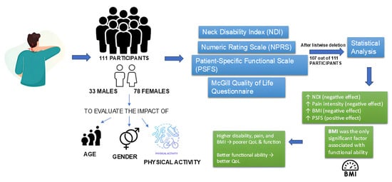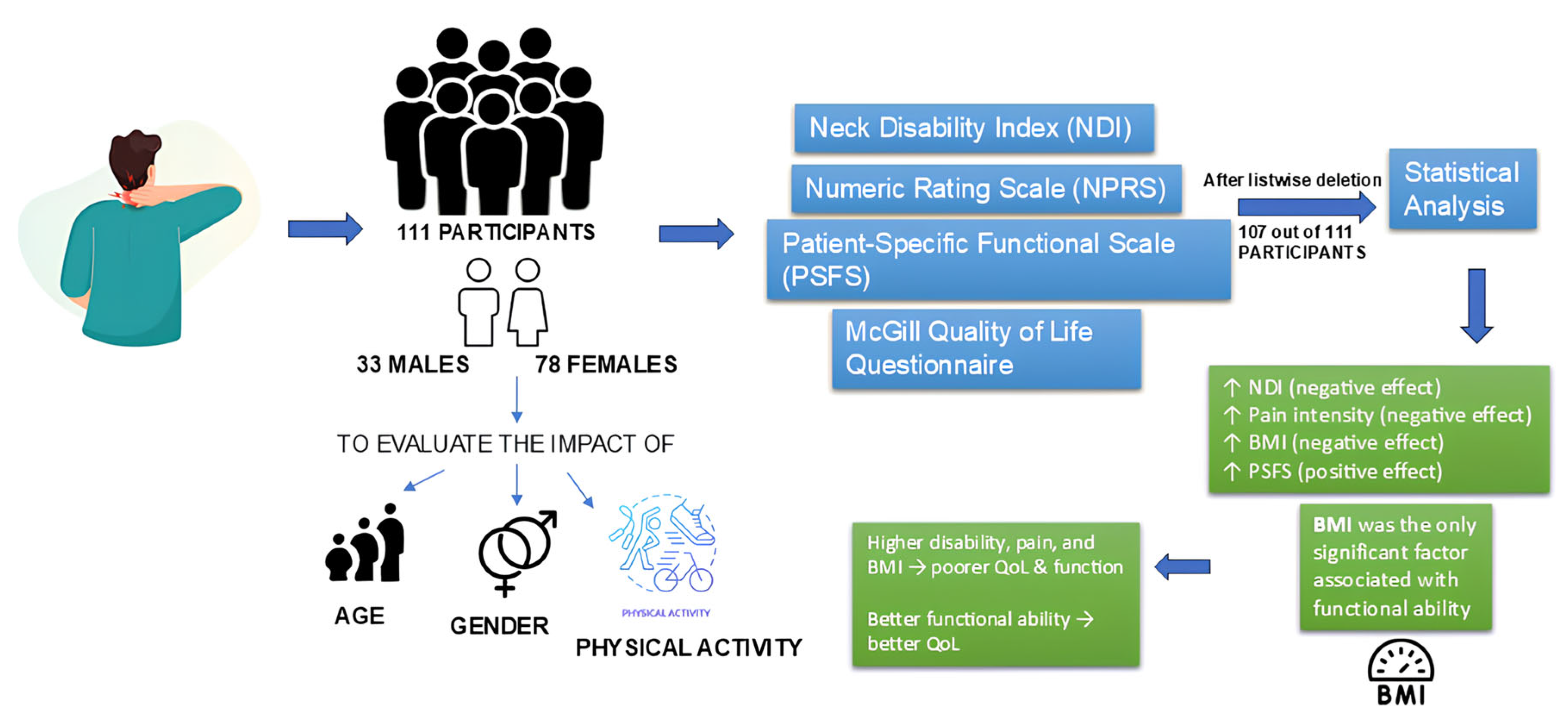 Therefore, this cross-sectional study aims to (1) outline pain intensity, disability, functional performance, QoL, and key clinical measures in adults with cervical spondylosis; (2) quantify bivariate associations among NPRS, NDI, PSFS, MQOL, ROM, and BMI; and (3) build multivariable models to analyse independent associations of QoL, incorporating pain, disability, functional performance, body mass index, and adjusting for demographic factors (age, gender, profession). The objective of this study was to investigate how pain, disability, physical function, and BMI collectively relate to quality of life among adults with cervical spondylosis. It is hypothesised that higher pain intensity will be associated with higher disability, lower PSFS scores, and lower QoL; that NDI will show robust inverse correlations with PSFS and QoL than pain alone; and that ROM will explain additional variance in functional performance beyond pain and disability. By joining routinely collected clinic measures with validated PROMs, the findings aim to provide rational, evidence-informed guidance for prioritising assessments and interventions in sports and rehabilitation practice.