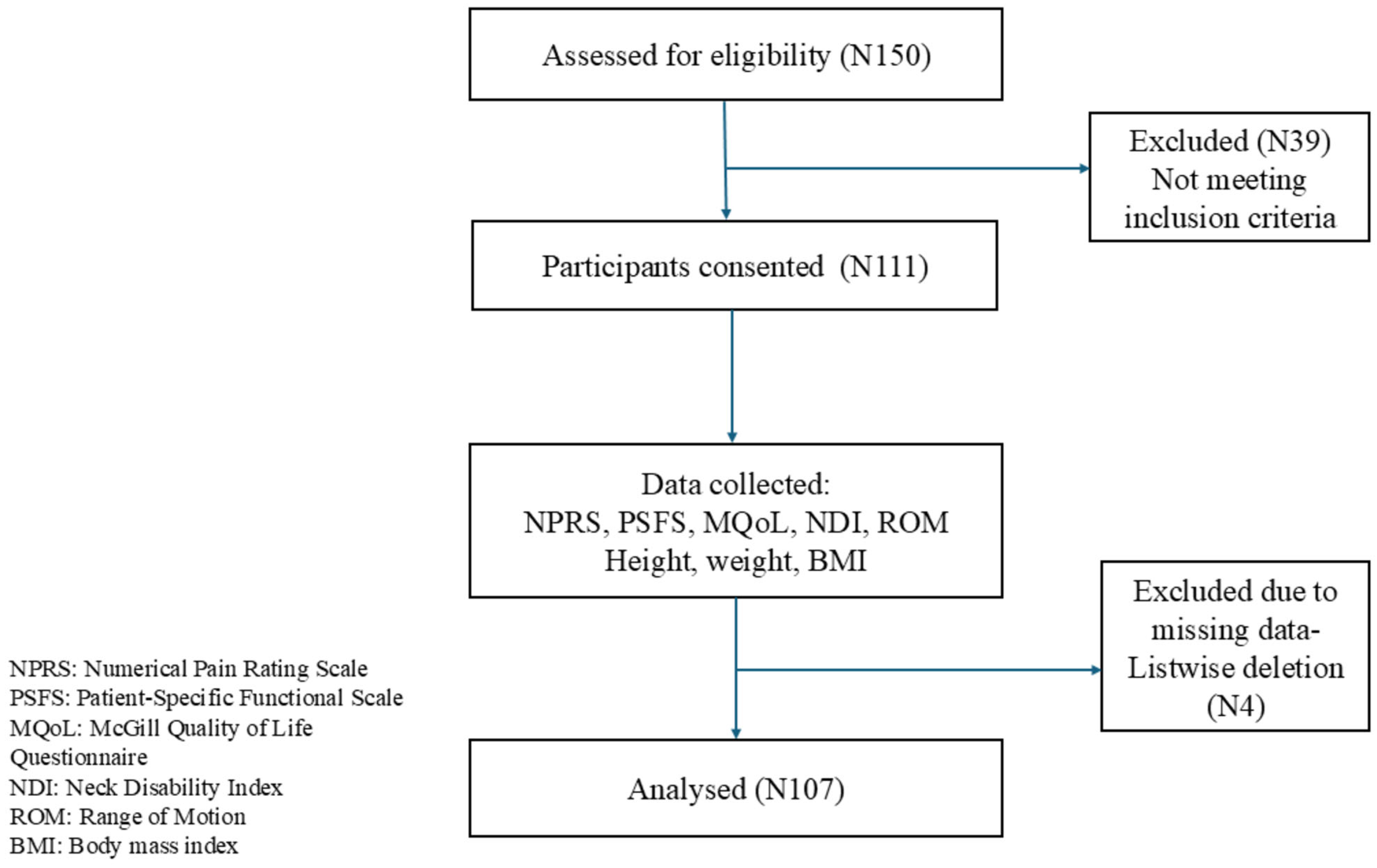 Of the 150 screened patients, 111 participants aged from 18–70 years satisfied the inclusion eligibility criteria; data of 107 out of 111 participants were further analysed due to missing data. Ethical approval to conduct the research was obtained from the Kosovo Chamber of Physiotherapy (Prishtina, Kosovo) (Prot. No. 473), and written informed consent, along with a publication agreement, was obtained from all participants before the process of data collection. Each participant underwent standardised clinical and self-reported assessments during a single visit.