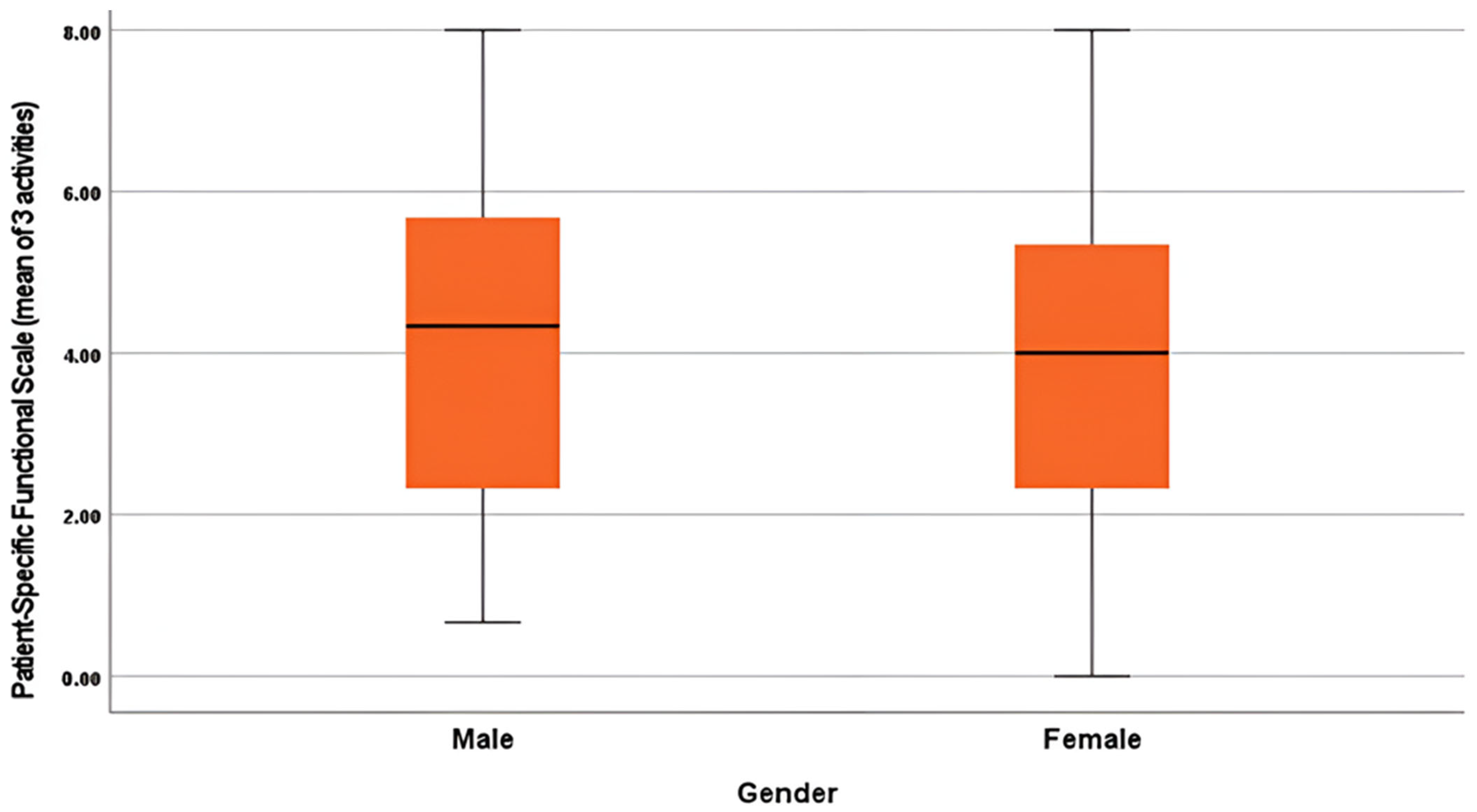 Regarding physical activity status, participants who were working in active professions (M = 7.05, SD = 1.76) and those with a sedentary form of profession (M = 7.04, SD = 1.95) verified nearly identical pain scores, with no significant difference (t(109) = 0.05, p = 0.961). Differences in neck disability (t(109) = 0.90, p = 0.368), functional ability (t(109) = −0.71, p = 0.478), and MQOL (t(109) = −0.92, p = 0.358) were also nonsignificant (Table 5). Effect size estimates for all comparisons were found to be negligible (Cohen’s d = −0.17 to 0.17), signifying that activity level based on the profession of an individual did not meaningfully influence pain, disability, or quality of life. Figure 3 displays the gender distribution of Patient-Specific Functional Scale (PSFS) scores. Both males and females demonstrated similar ranges and median values, supporting the statistical result of no significant difference (p = 0.587 *).