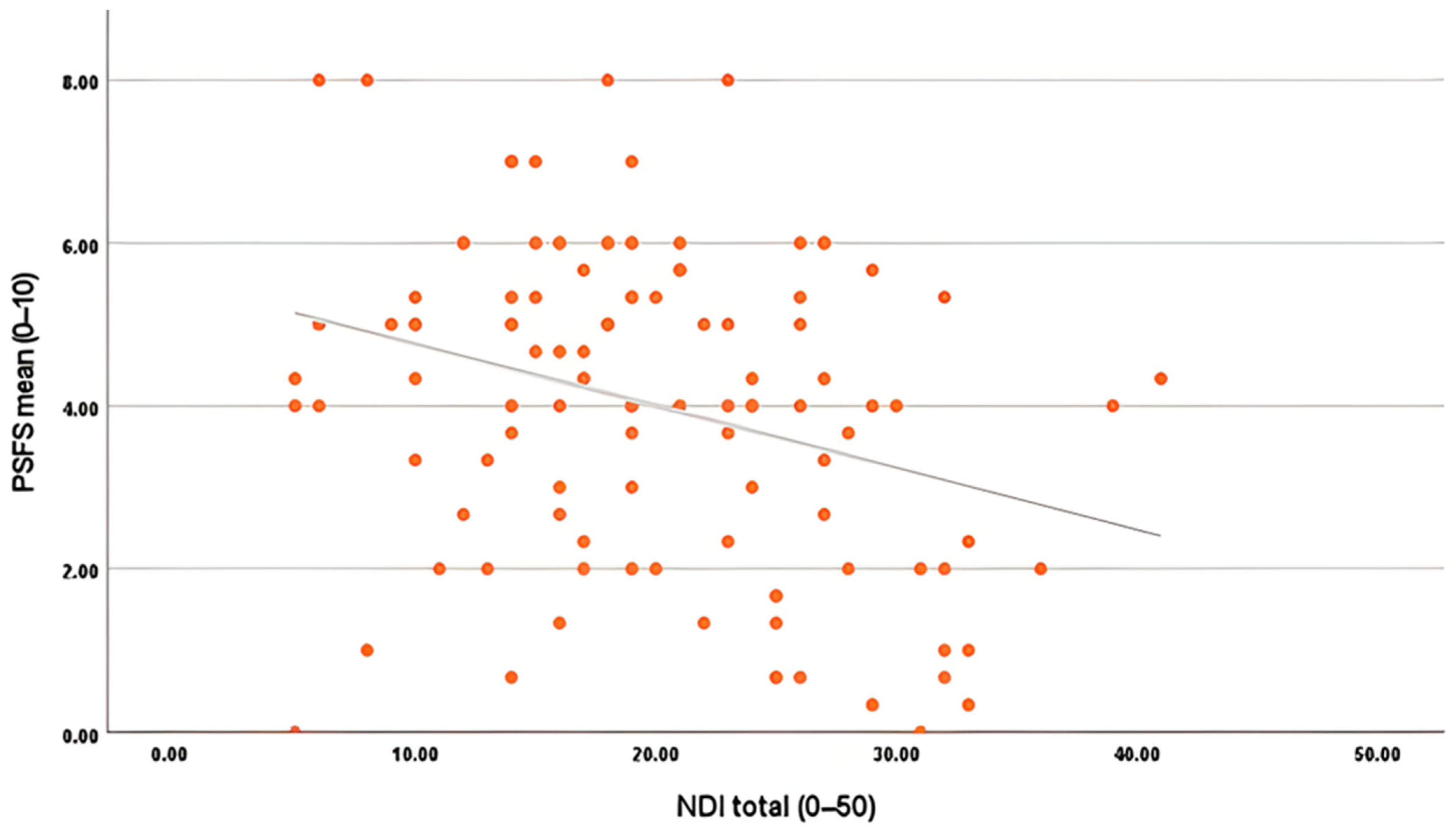 After the multiple comparison using Tukey’s HSD test, two separate multiple linear regression models were constructed to identify explanatory variables of (a) overall quality of life (MQOL) and (b) functional ability (PSFS). Model 1, i.e., independent correlate of quality of Life (MQOL), showed that the regression model was found to be statistically significant (F(13, 93) = 7.04, p < 0.001), explaining 49.6% of the variance in MQOL scores (R2 = 0.496, Adjusted R2 = 0.426). An Adjusted R2 of 0.426 indicates a moderate level of explained variance, which is expected in multidimensional musculoskeletal conditions where psychological, social, and environmental determinants contribute to quality-of-life outcomes beyond clinical measures alone. Among the predictors, Neck Disability Index (NDI) (β = −0.366, p < 0.001), pain intensity (NPRS) (β = −0.252, p = 0.006), Patient-Specific Functional Scale (PSFS) (β = 0.238, p = 0.006), and Body Mass Index (BMI) (β = −0.298, p < 0.001) appeared as significant independent correlates that explained variance in quality of life (Table 7). Figure 4 shows the relationship between neck disability (NDI) and functional ability (PSFS). A clear negative linear trend is visible, indicating that patients with higher disability scores tend to report lower functional ability. The scatter is moderately dispersed, suggesting individual variation, yet the fitted line confirms a downward slope consistent with the regression output (β = −0.207).