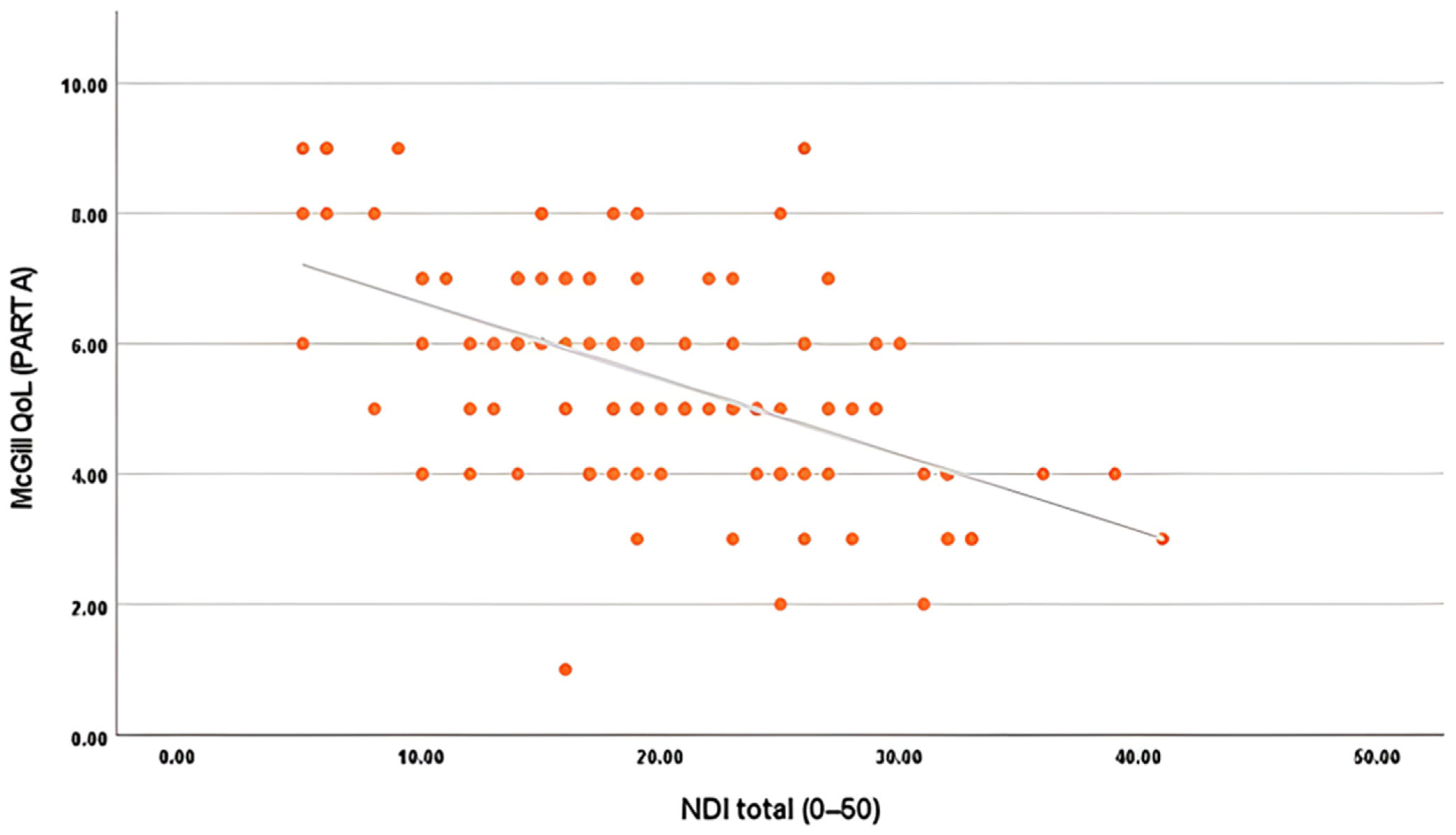 Among these, only Body Mass Index (BMI) (β = −0.230, p = 0.030) showed a significant negative association, indicating that higher BMI is associated with lower self-reported functional ability. Pain (NPRS), disability (NDI), and other demographic or biomechanical factors (age, gender, activity, or range of motion) were not significant in this model. Figure 5 depicts the relationship between NDI with quality of life (MQOL, Part A). The negative slope proves that increasing neck disability is strongly associated with lower QoL scores. This result aligns with the regression findings where NDI (β = −0.366, p < 0.001) was observed as one of the strongest independent correlates of QoL.