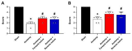 Outcomes of behavioral tests at 8 weeks post-facial nerve injury induced by axotomy. (A) Whisker movement (vibrissae muscle) test and (B) Eyelid blink reflex test. The axotomy group exhibited a significant decrease in test scores compared to the sham group, indicating impaired function due to nerve injury. In contrast, both the forward suture and reverse suture groups showed significant improvement in scores relative to the axotomy group, demonstrating the efficacy of both suturing techniques in mitigating the effects of facial nerve injury. Data are presented as means ± SEM. Statistical significance is indicated by (* p < 0.05 vs. Sham group) and (# p < 0.05 vs. Axotomy group).