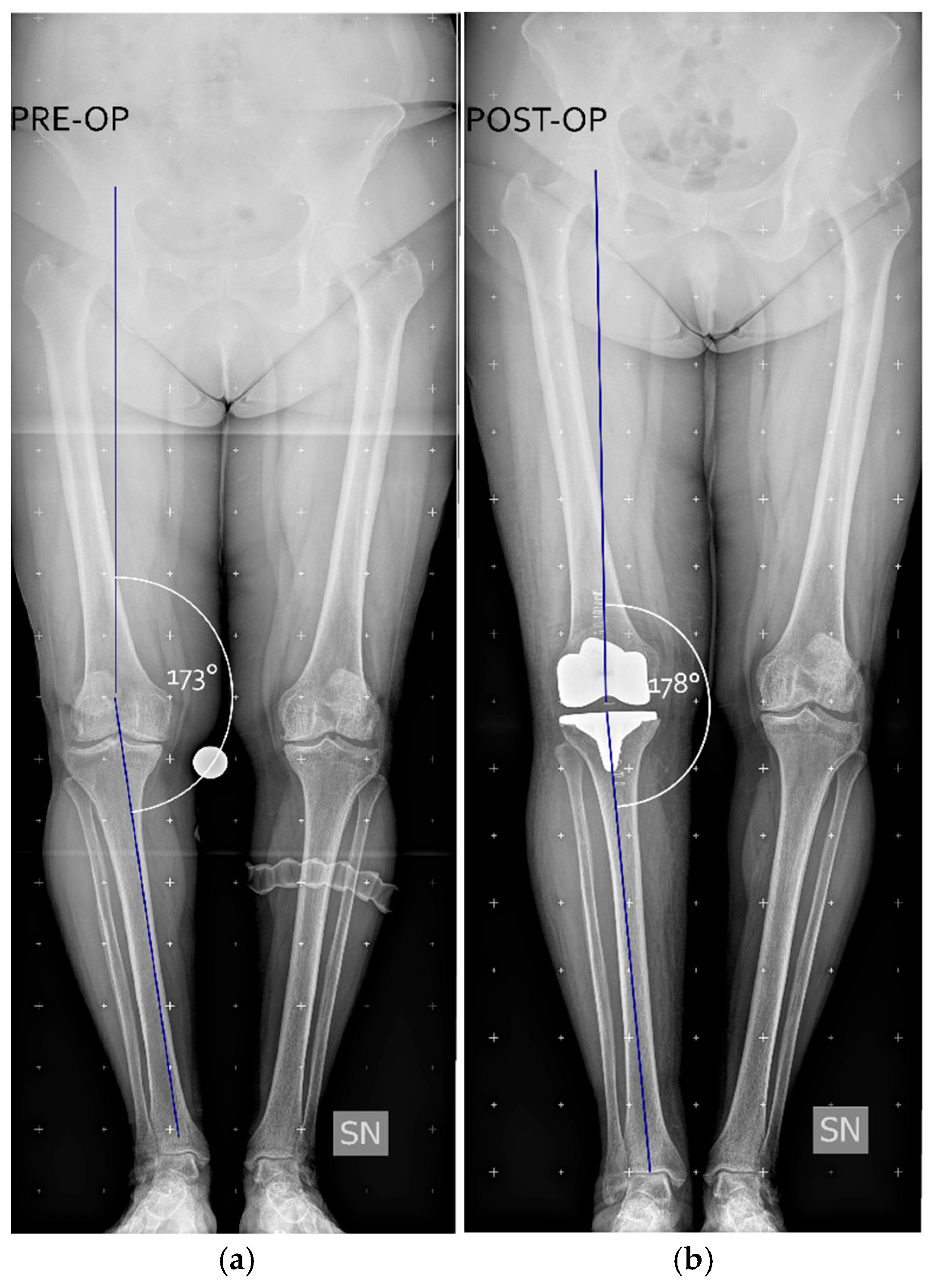 - Magnussen, R.A.; Weppe, F.; Demey, G.; Servien, E.; Lustig, S. Residual Varus Alignment Does Not Compromise Results of TKAs in Patients with Preoperative Varus. Clin. Orthop. Relat. Res. 2011, 469, 3443–3450. [Google Scholar] [CrossRef] [PubMed]
