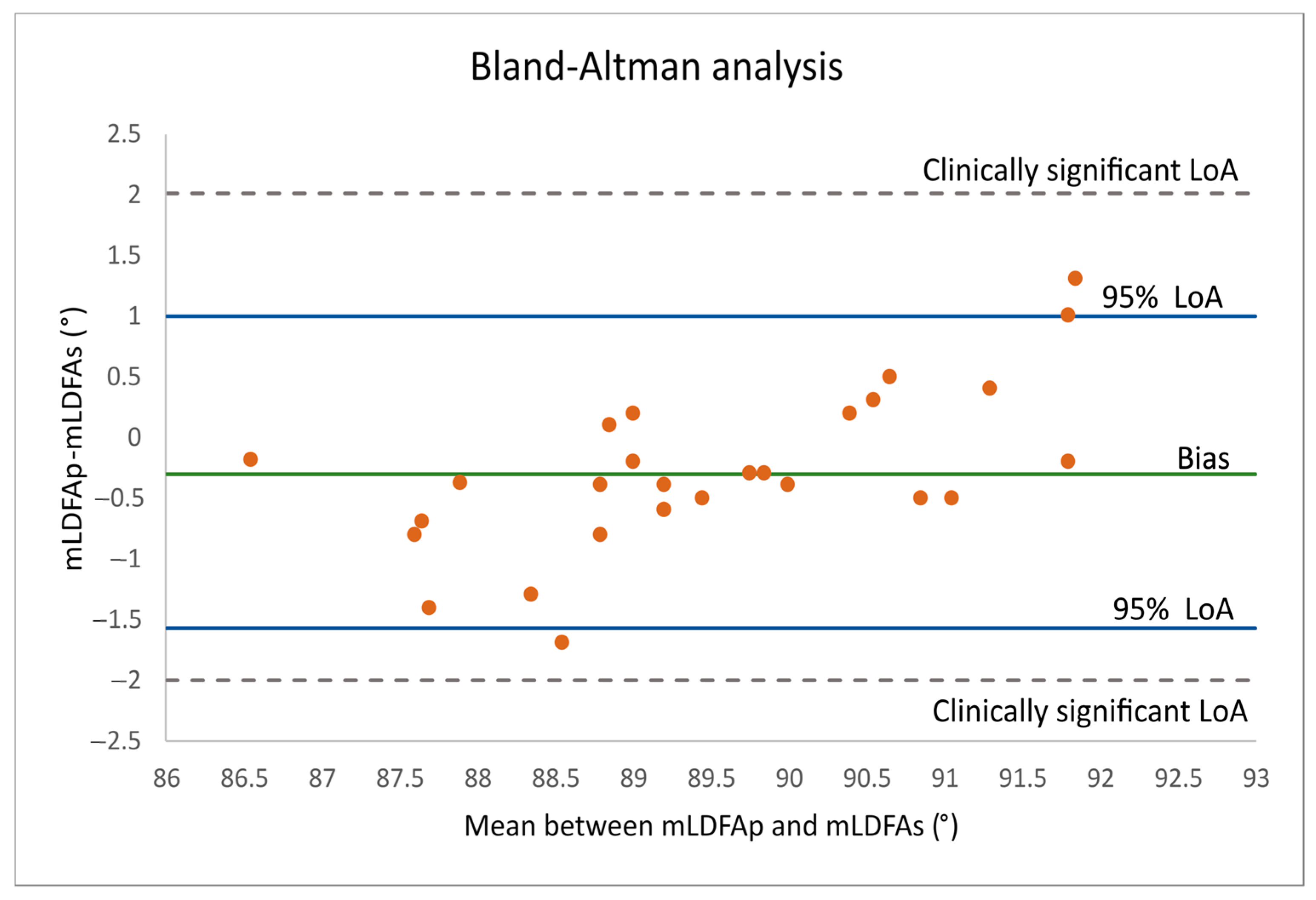 The Bland–Altman analysis demonstrated good agreement between mLDFAp and mLDFAs. The mean difference (bias) was small and negative (approximately −0.3°), indicating that mLDFAp slightly underestimated mLDFAs. The 95% LoA values were narrow and entirely within the predefined clinically acceptable limits (±2°).