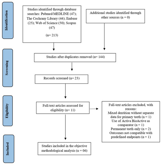 A total of 213 records were identified through database searches conducted in December 2025, including PubMed/MEDLINE (47), Embase (25), Web of Science (50), The Cochrane Library (44), and Scopus (50). No additional eligible studies were identified through searches of trial registries, gray literature sources, or screening of reference lists. After removing duplicates, 144 records remained for screening. Based on title and abstract analysis, 133 articles were excluded for not meeting the predefined inclusion criteria, resulting in 11 articles selected for full-text assessment. Following the full-text evaluation, five studies were excluded, and the reasons for full-text exclusions are presented in Supplementary Table S2. Therefore, a total of six studies were included in the final methodological analysis (Figure 1).