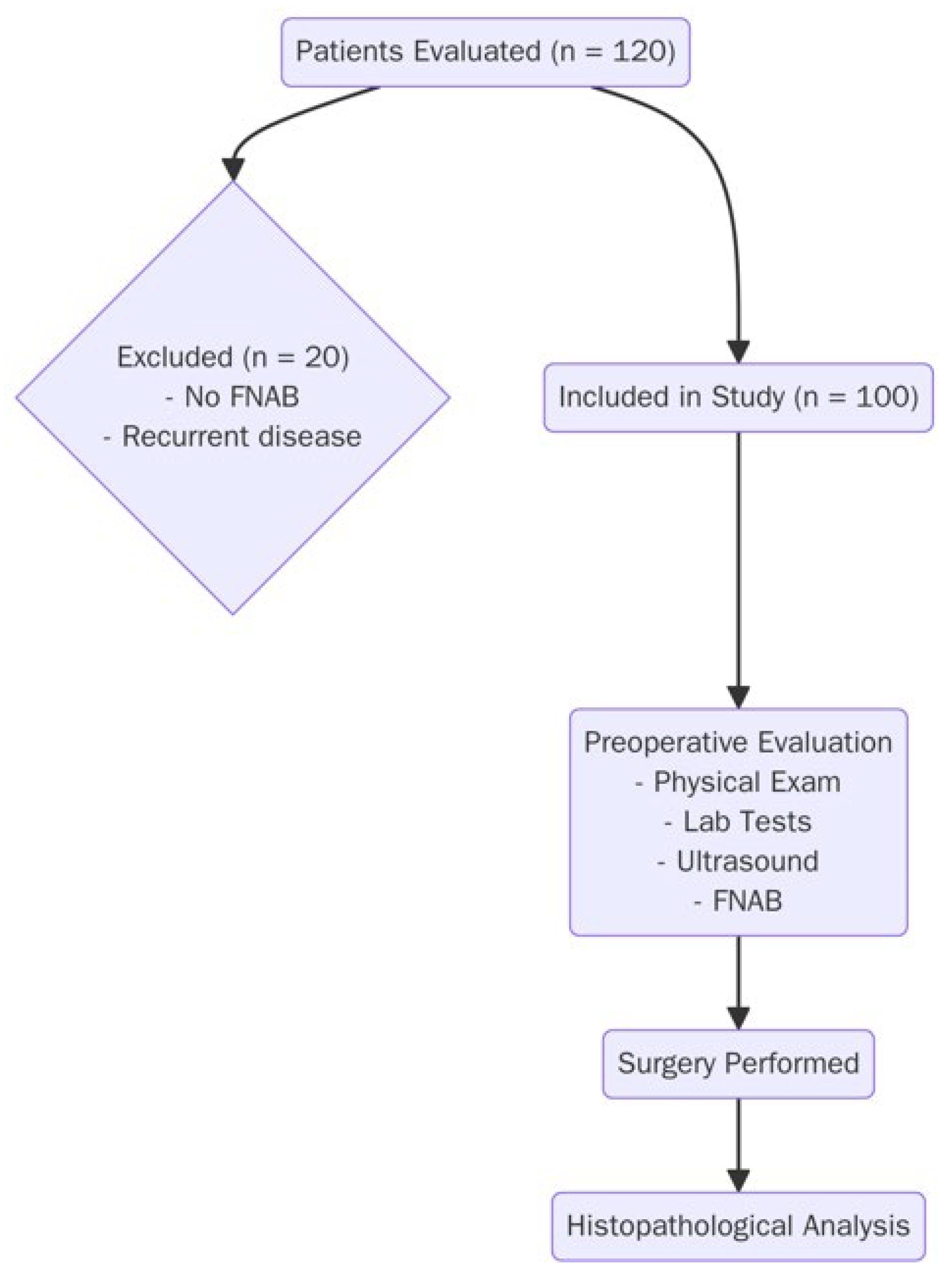 - Osseis, M.; Jammal, G.; Kazan, D.; Noun, R. Comparison between Fine Needle Aspiration Cytology with Histopathology in the Diagnosis of Thyroid Nodules. J. Pers. Med. 2023, 13, 1197. [Google Scholar] [CrossRef]