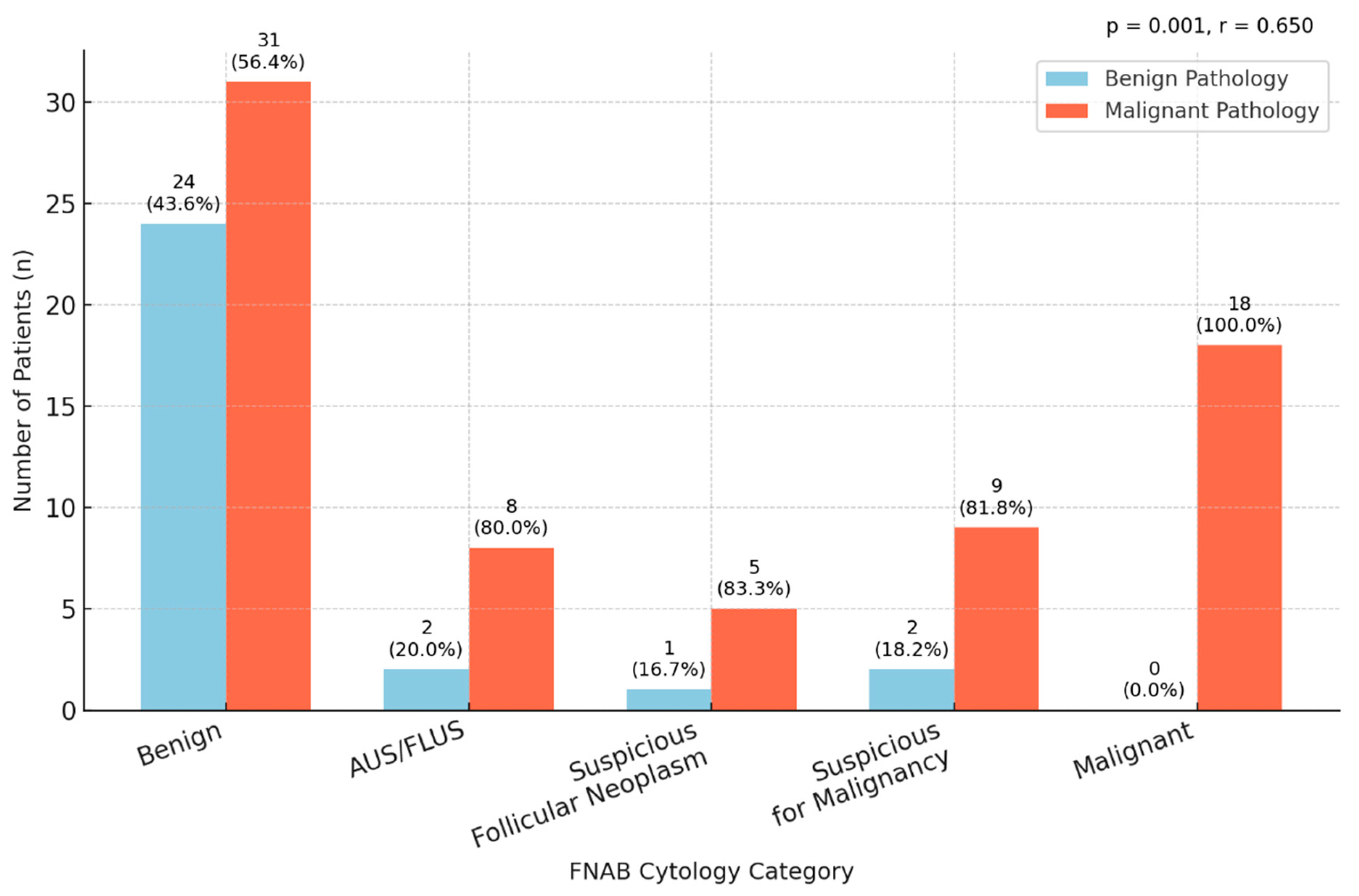 | FNAB Result | Benign Pathology n (%) | Malignant Pathology n (%) | Total n (%) | r and p-Value |