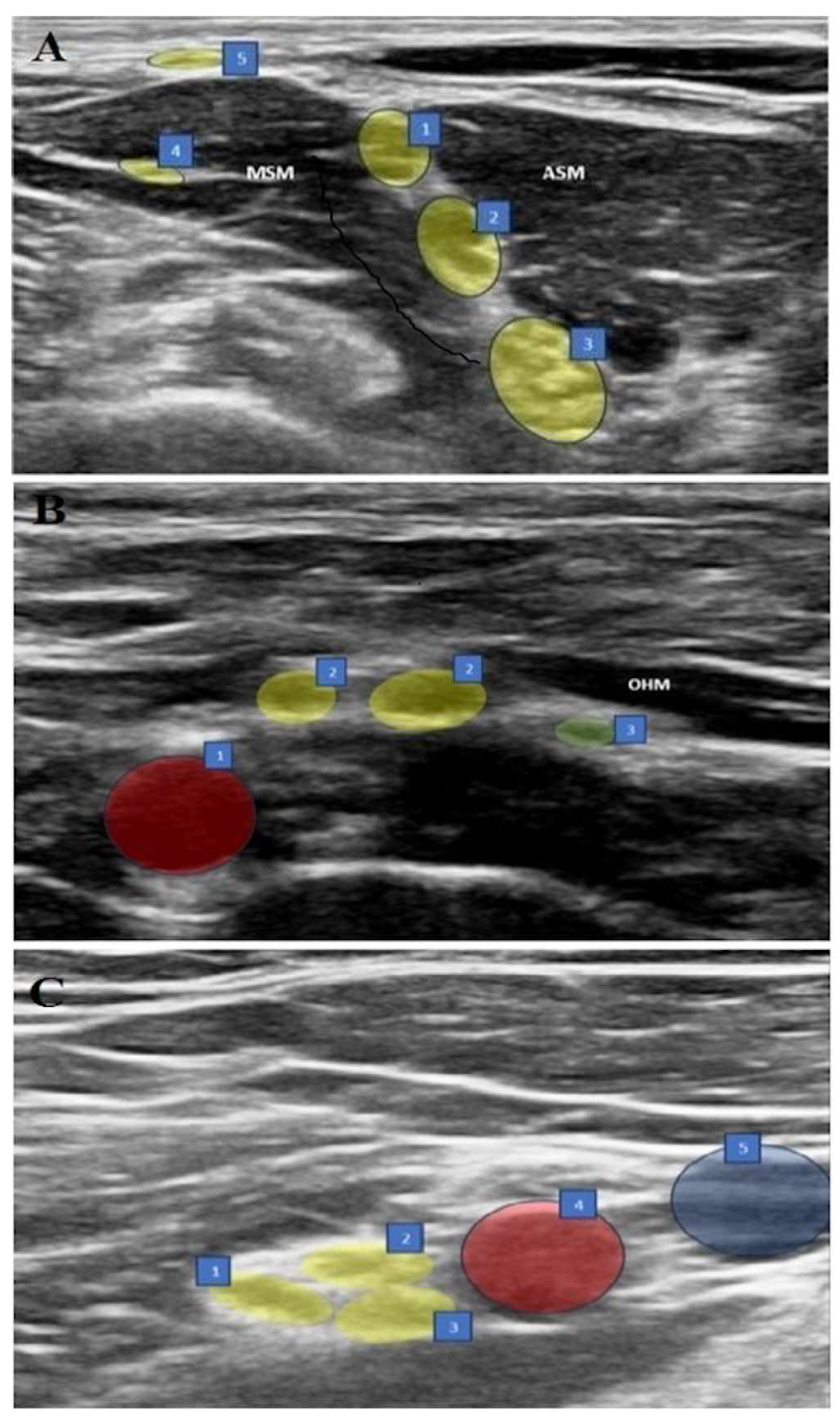 (A–C) Sonographic views of three blocks. (A) ISB: 1. C5 nerve root, 2. C6 nerve root, 3. C7 nerve root, 4. Long thoracic nerve, 5. Supraclavicular nerves, ASM: Anterior scalene muscle, MSM: Middle scalene muscle. (B) ASB: 1. Subclavian artery, 2. Upper trunk, 3. Suprascapular nerve, OHM: omohyoid muscle. (C) CCB: 1. Posterior cord, 2. Lateral cord, 3. Medial cord, 4. Axillary artery, 5. Axillary vein.
