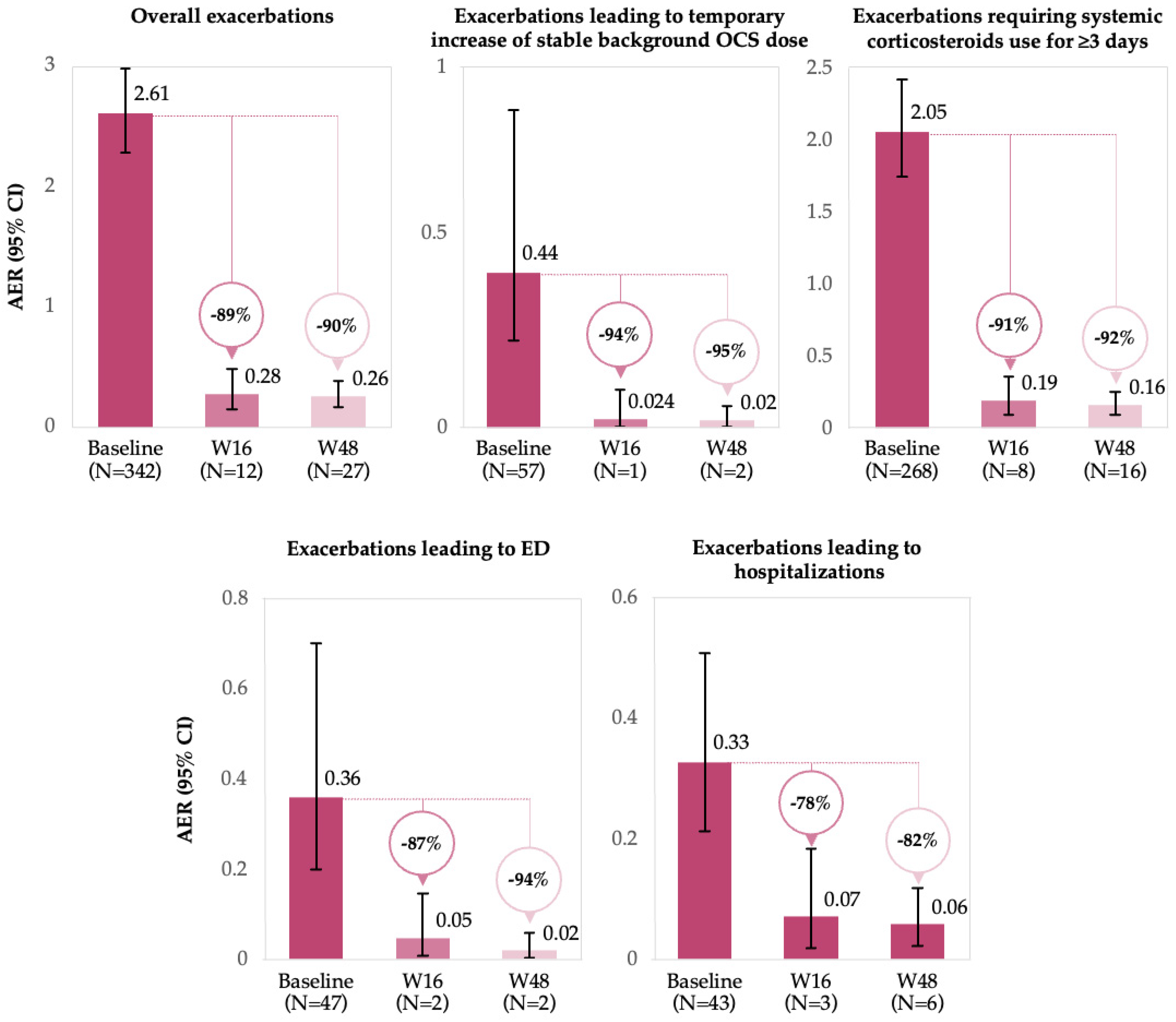 - Disease and clinical characteristics: frequency and rate of exacerbations (overall and those leading to emergency department [ED] visits, hospitalizations, and systemic corticosteroid use for at least 3 days or temporary increase in stable mOCS use); laboratory parameters (if available): blood eosinophils (bEOS), fractional exhaled nitric oxide (FeNO) level, and total immunoglobulin E (IgE); lung function measurements, if available (forced expiratory volume in 1 s [FEV1]), and asthma control test (ACT) scores; healthcare resource utilization in the last 12 months prior to benralizumab start.