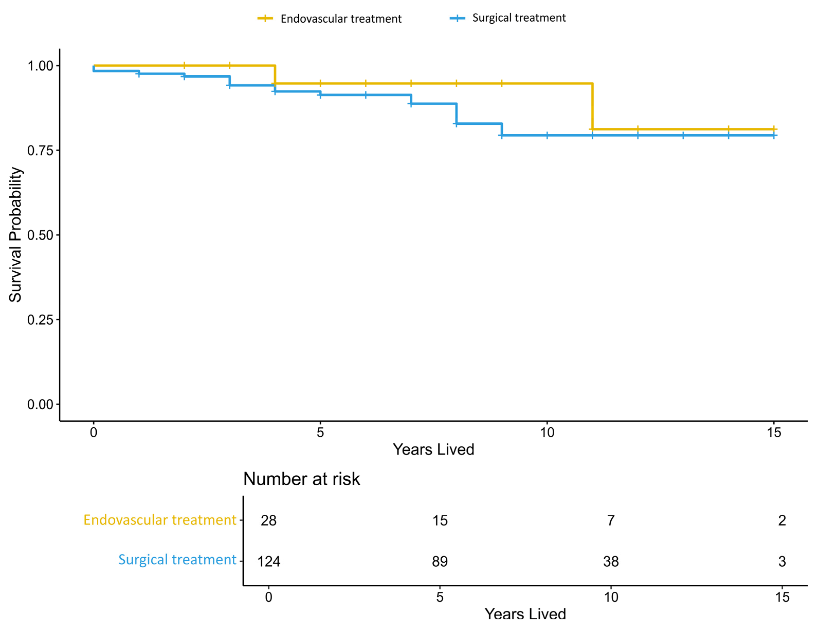 3.1.4. Pre-Matching Radiological Follow-Up in the Endovascular Group and Retreatment Rates