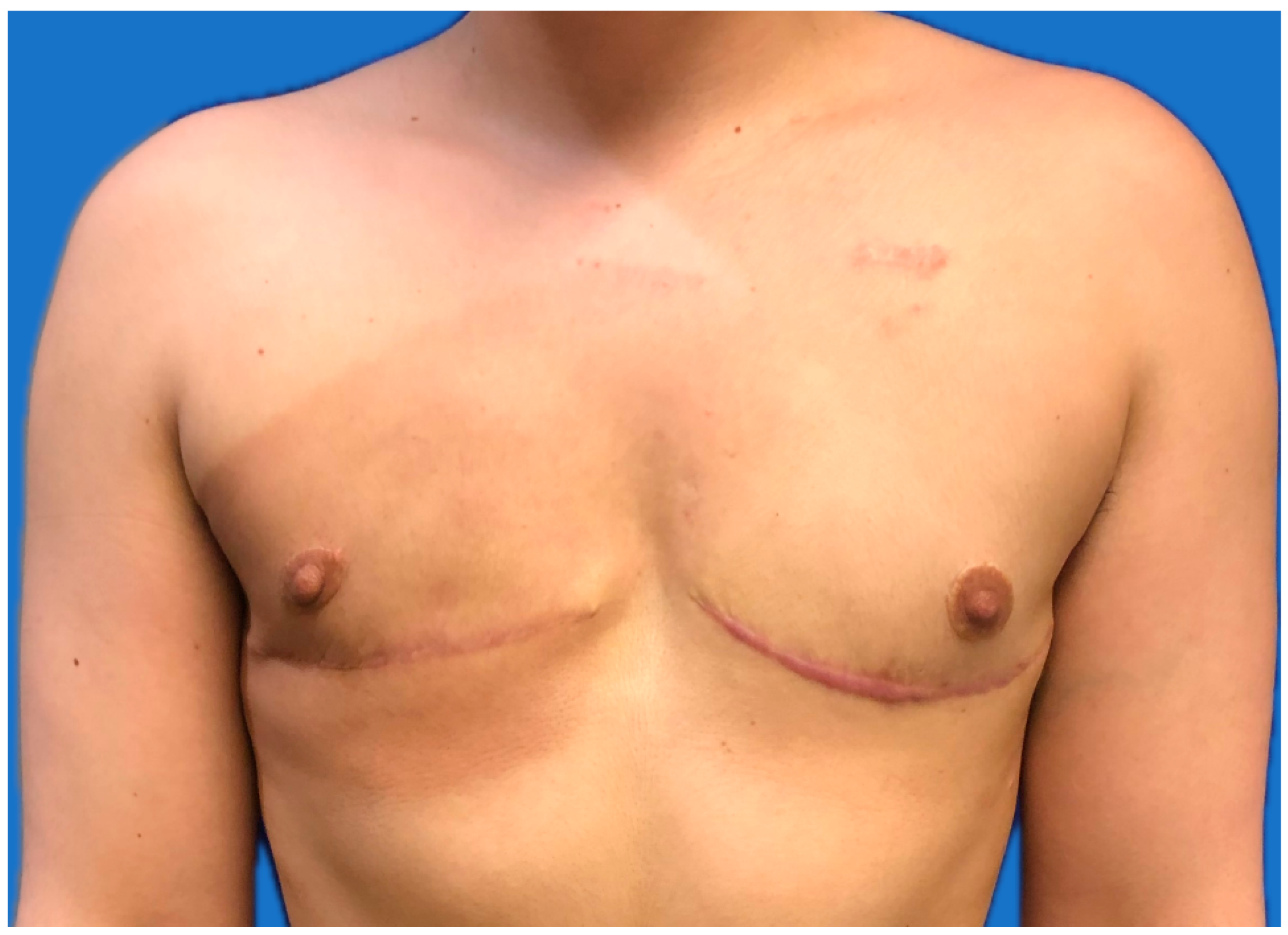 Figure 6). Similar to the double-incision mastectomies and Goldilocks technique, the IMF is purposely obliterated to improve chest contour. The patient is then sent home with continuous compression and bilateral drains to help the soft tissue contract down to the chest wall. Once post-operative swelling subsides and the incisions have healed, the patient is assessed for planned staged reconstruction with nipple and/or areola reduction, liposuction, and fat grafting.
