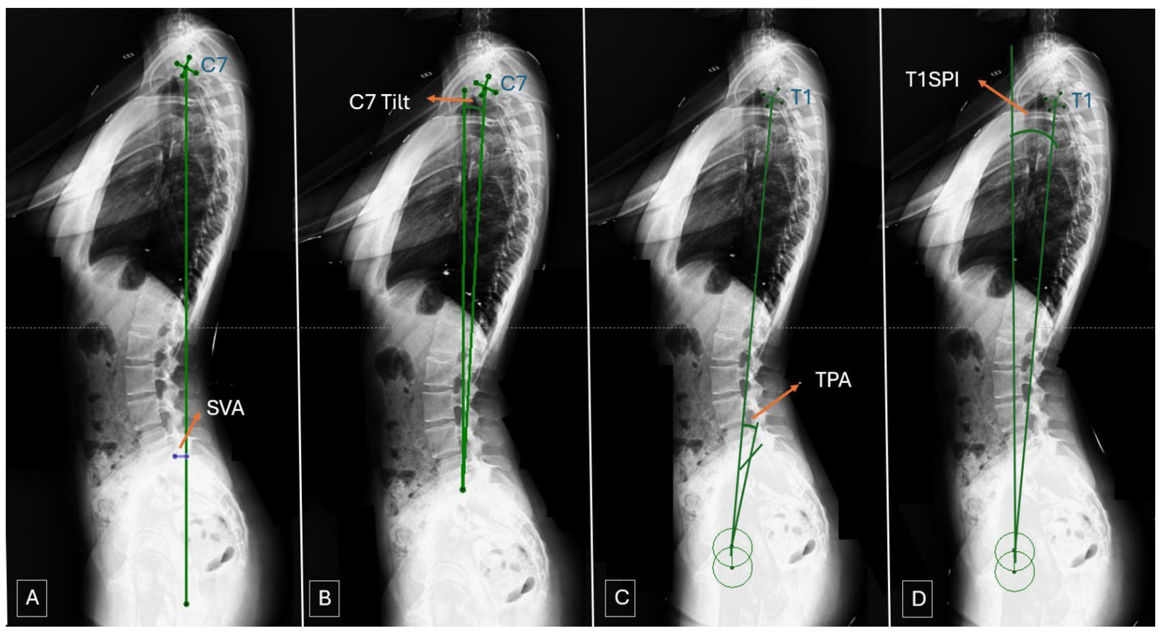 | C7 Tilt (°) | −2.03 ± 2.43 | 3.48 ± 16.54 | −3.58 ± 6.99 | 0.356 |