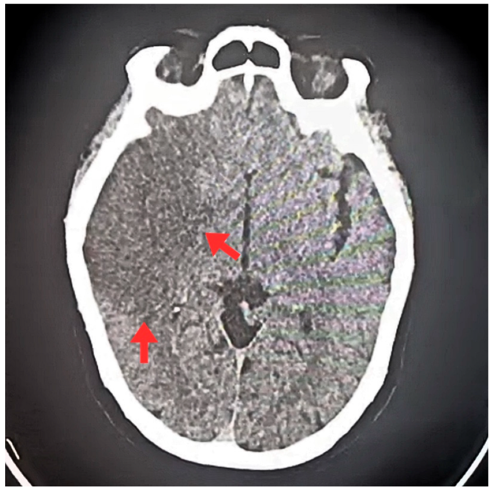 | Glasgow Coma Scale (GCS) | Eye opening (O): 4 | 11/15 | 3–15 | Preserved consciousness; patient alert and oriented |