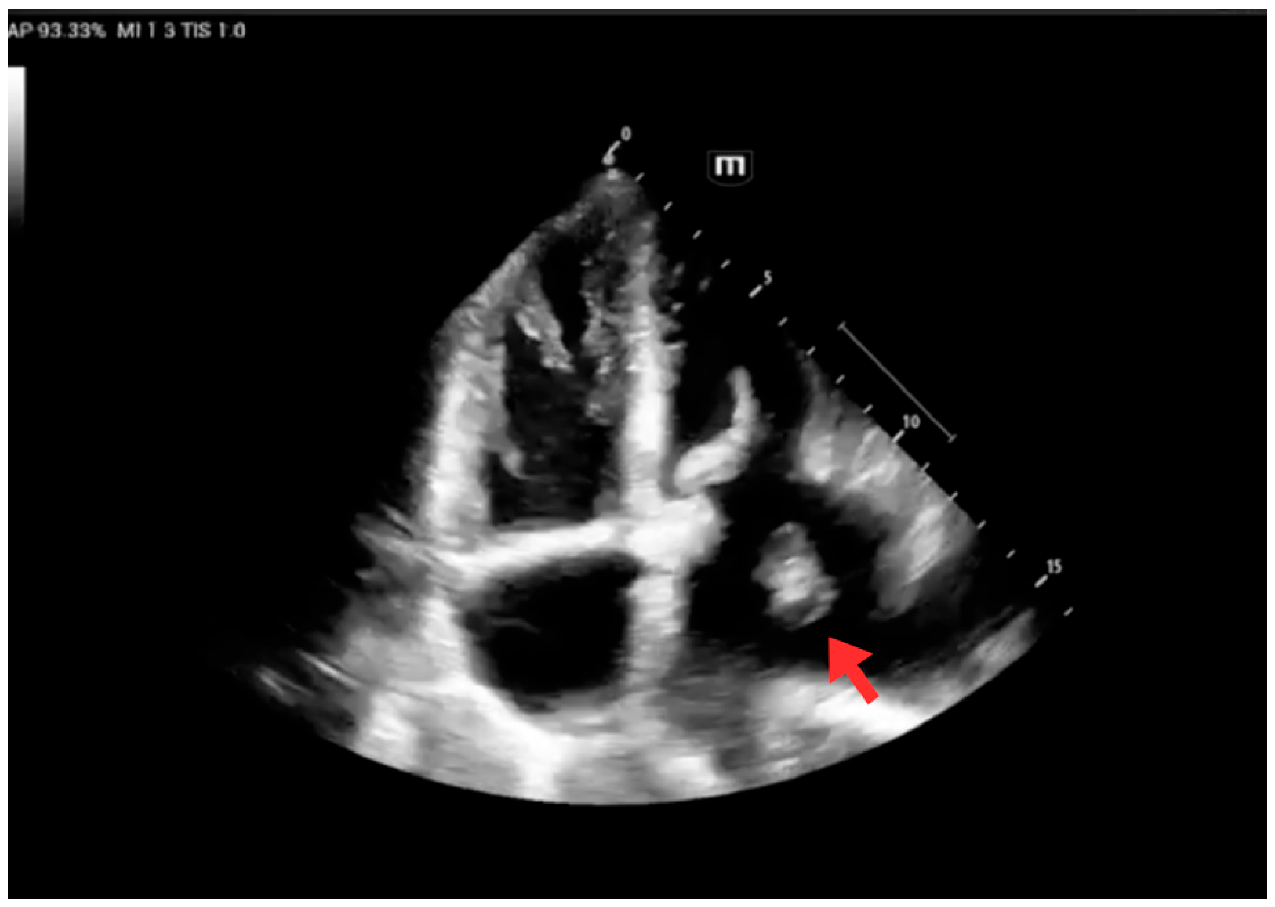 | Follow-up echocardiography | Hospital | Persistent LA thrombus, stable/partially organized; no fragmentation signs. | TTE: persistent thrombus; LVEF 48%. | Continue anticoagulation + rhythm control | Thrombus stable; preserved LV function |