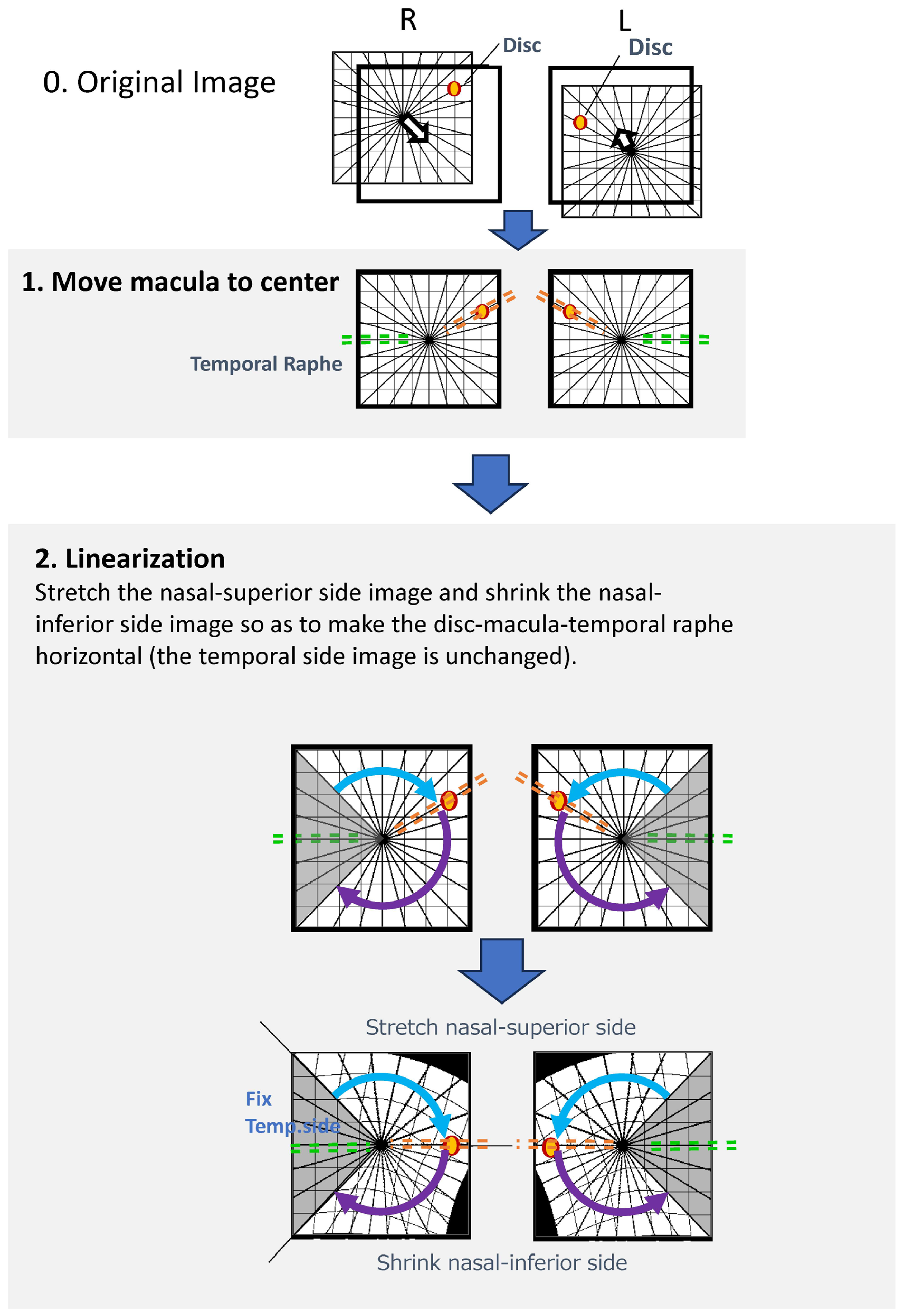 Linearization Program: An affine transformation was applied to align the anatomical structures. After detecting the disc and foveal centers, the region superior to the disc–fovea line was vertically stretched, and the region inferior to it was compressed to ensure complete horizontal alignment of the disc–fovea axis. The temporal region within ±60 degrees from the fovea was preserved without distortion to maintain the anatomical configuration of the temporal raphe.