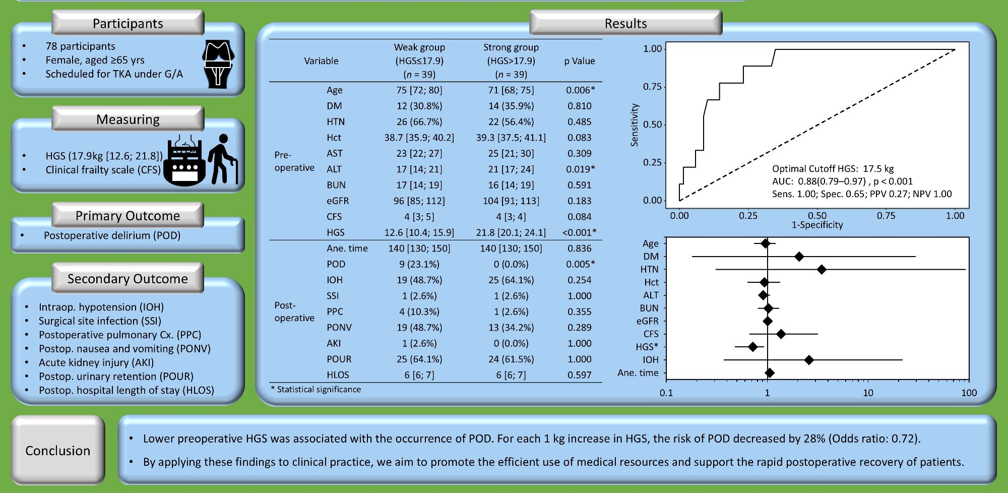 - Qian, J.; Shen, X.; Gao, X.; Sun, Q. Grip Strength is a Predictor for Subsyndromal Delirium Among Older Adults Following Joint Replacement. Clin. Interv. Aging 2023, 18, 1675–1685. [Google Scholar] [CrossRef]