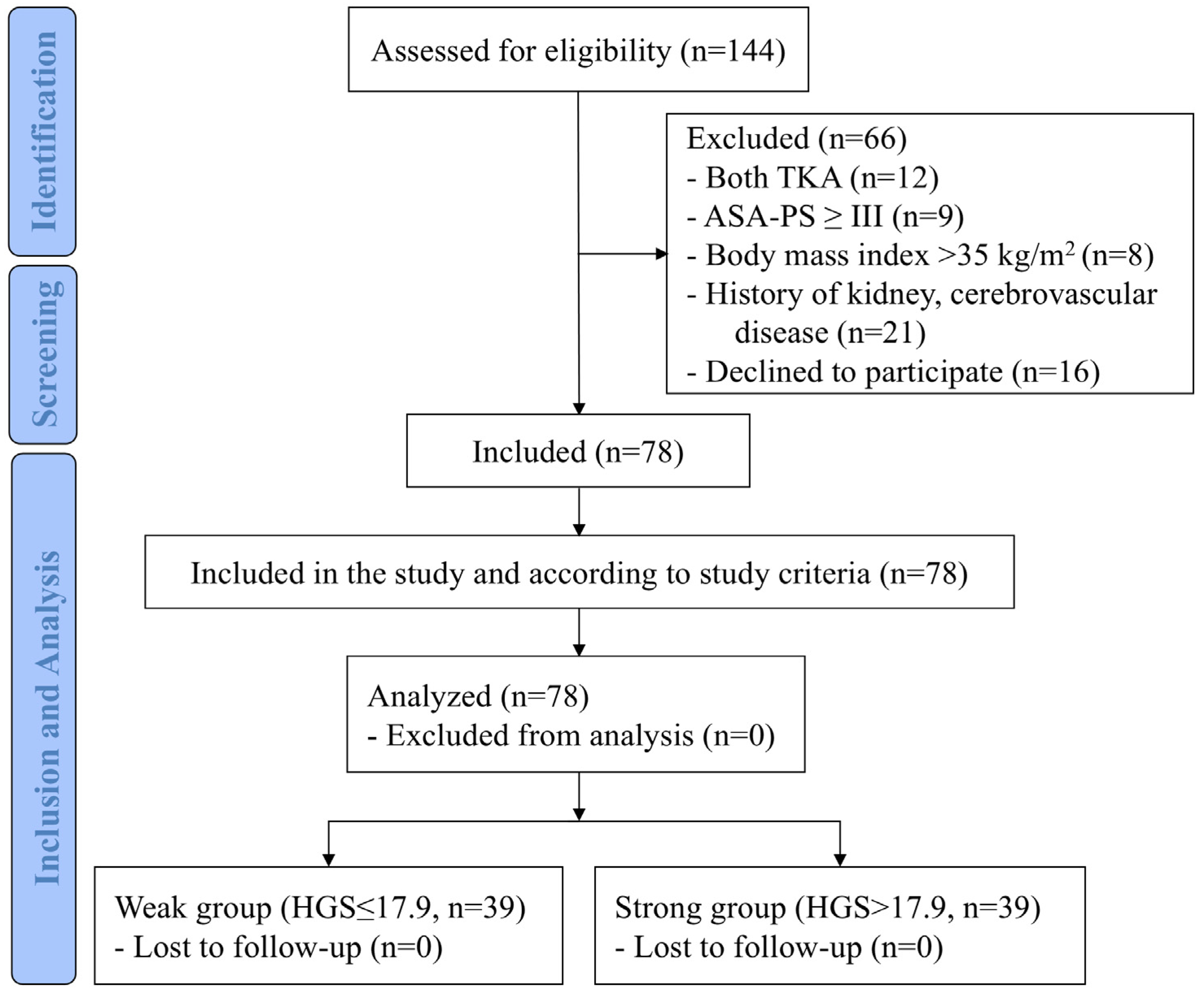 APA StyleLee, S., Kim, D. Y., Kong, M., You, A. H., Kim, J. E., & Kang, H. Y. (2026). Effect of Hand Grip Strength on Perioperative Outcomes in Older Female Patients Scheduled for Total Knee Arthroplasty Under General Anesthesia—A Prospective Observational Study. Journal of Clinical Medicine, 15(2), 463. https://doi.org/10.3390/jcm15020463