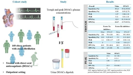 Pannunzio, A.; Castellani, V.; Baldacci, E.; Cammisotto, V.; Mormile, R.; Palumbo, I.M.; Porcu, N.; Chistolini, A.; Bernardini, G.; Menichelli, D.; et al. Diagnostic Performance of a DOAC Urine Dipstick in Obese Outpatients with Atrial Fibrillation: Comparison with Plasma Concentrations. J. Clin. Med. 2026, 15, 466. https://doi.org/10.3390/jcm15020466
