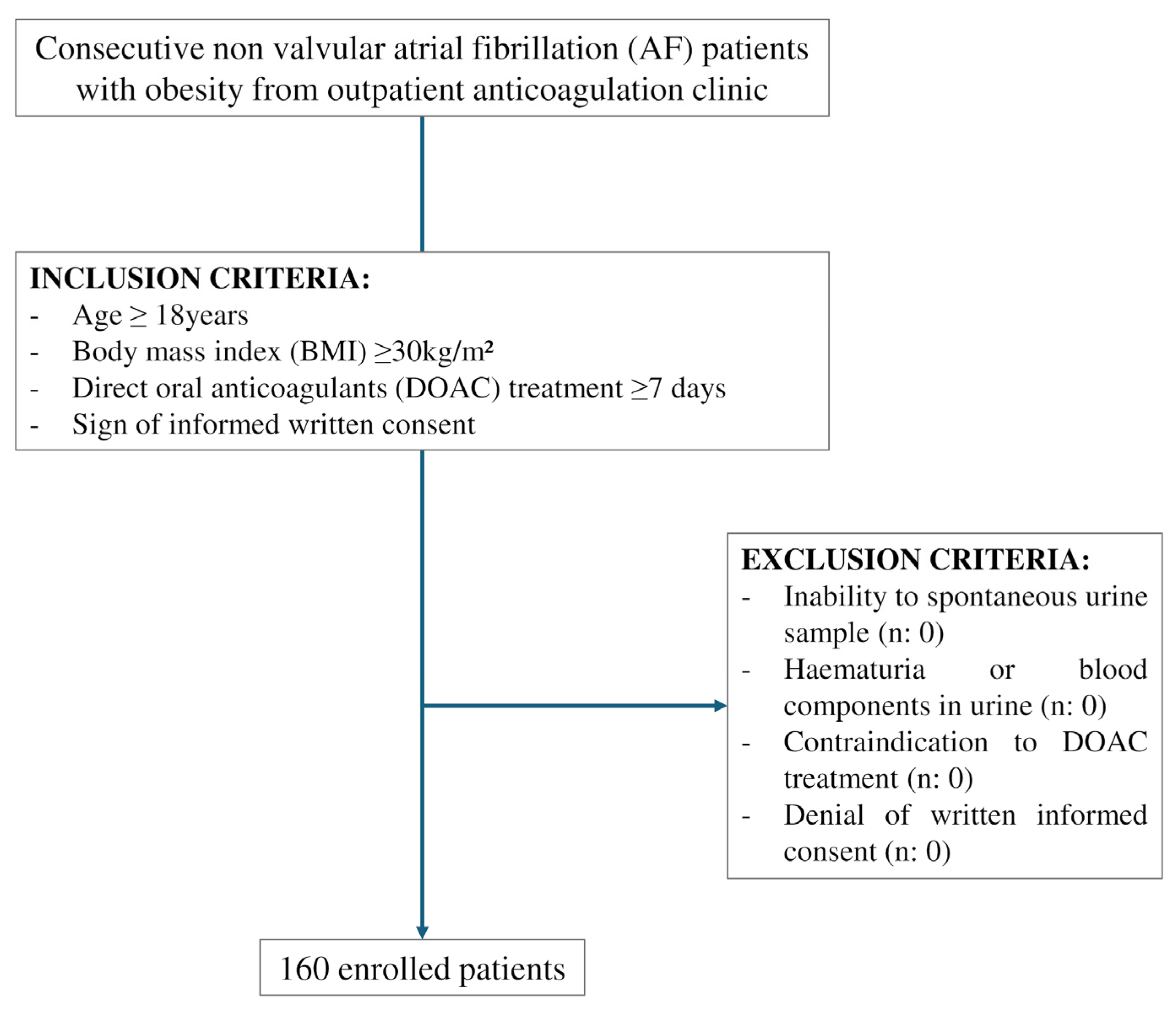 - Menichelli, D.; Pannunzio, A.; Baldacci, E.; Cammisotto, V.; Castellani, V.; Mormile, R.; Palumbo, I.M.; Chistolini, A.; Violi, F.; Harenberg, J.; et al. Plasma Concentrations of Direct Oral Anticoagulants in Patients with Nonvalvular Atrial Fibrillation and Different Degrees of Obesity. Clin. Pharmacokinet. 2025, 64, 453–462. [Google Scholar] [CrossRef] [PubMed]