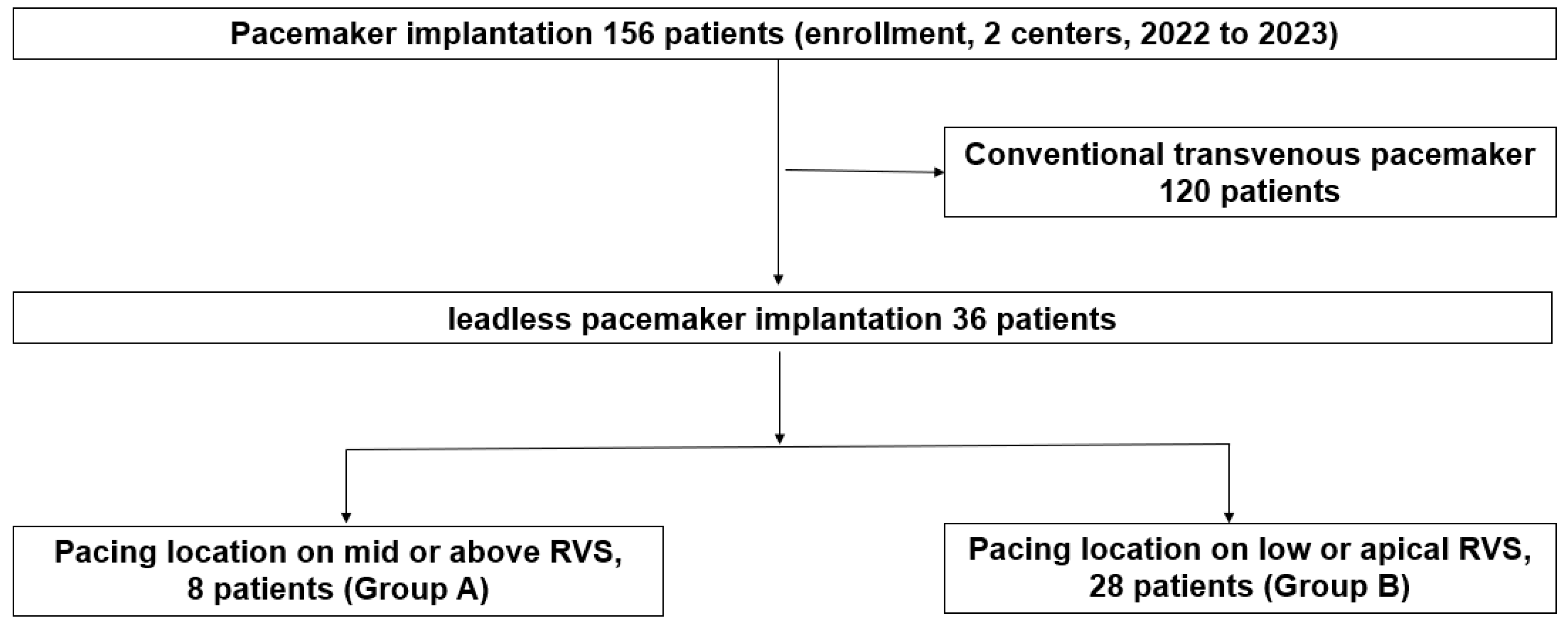 - Li, Q.Y.; Dong, J.Z.; Guo, C.J.; Fang, D.P.; Liu, X.; Dai, W.L. Initial studies on the implanting sites of high and low ventricular septa using leadless cardiac pacemakers. Ann. Noninvasive Electrocardiol. 2023, 28, e13068. [Google Scholar] [CrossRef] [PubMed] [PubMed Central]
