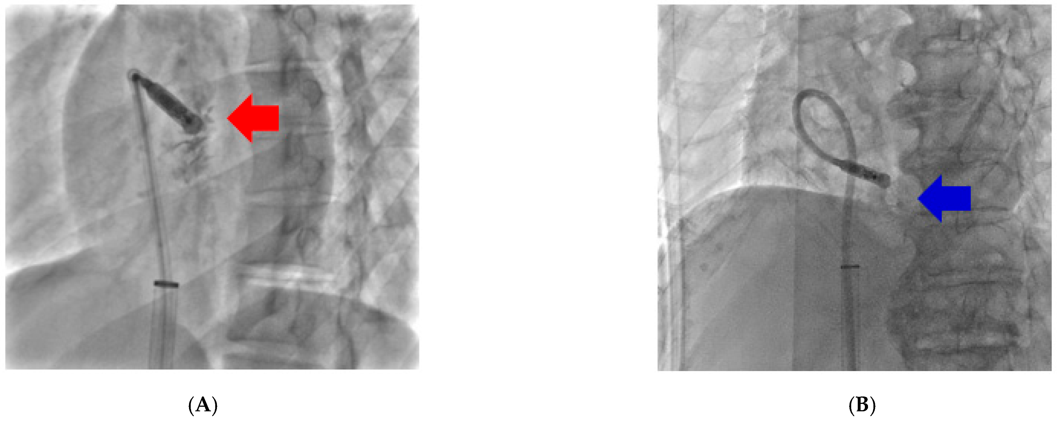 - Arai, H.; Mizukami, A.; Hanyu, Y.; Kawakami, T.; Shimizu, Y.; Hiroki, J.; Yoshioka, K.; Ohtani, H.; Ono, M.; Yamashita, S.; et al. Leadless pacemaker implantation sites confirmed by computed tomography and their parameters and complication rates. Pacing Clin. Electrophysiol. 2022, 45, 196–203. [Google Scholar] [CrossRef] [PubMed]