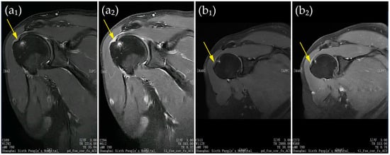 (a,b) Representative shoulder MRI scans of two patients at baseline. Panels (a1,b1) show proton density–weighted fast spin-echo images in the coronal plane with fat saturation and autocalibration for parallel imaging; panels (a2,b2) show T1-weighted fast spin-echo images in the same plane with identical parameters. Yellow arrows indicate partial-thickness ST tears. All patient-identifying information has been removed to protect privacy.