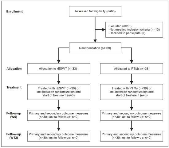 Of 69 randomized participants, 60 (30 per group) began treatment and were included in the mITT population. Nine participants (3 in the rESWT group, 6 in the PTMs group) withdrew before starting treatment and were excluded from efficacy analyses. No participant was lost to follow-up after treatment initiation.