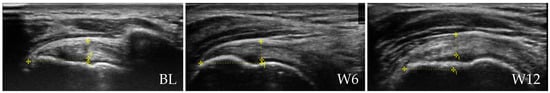 Figure 5 presents representative ultrasound images of the shoulder of a patient from the rESWT group at BL, W6 and W12, illustrating changes in AHD.