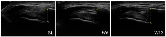 Figure 4 presents representative ultrasound images of the ST of a patient from the rESWT group at BL, W6 and W12.