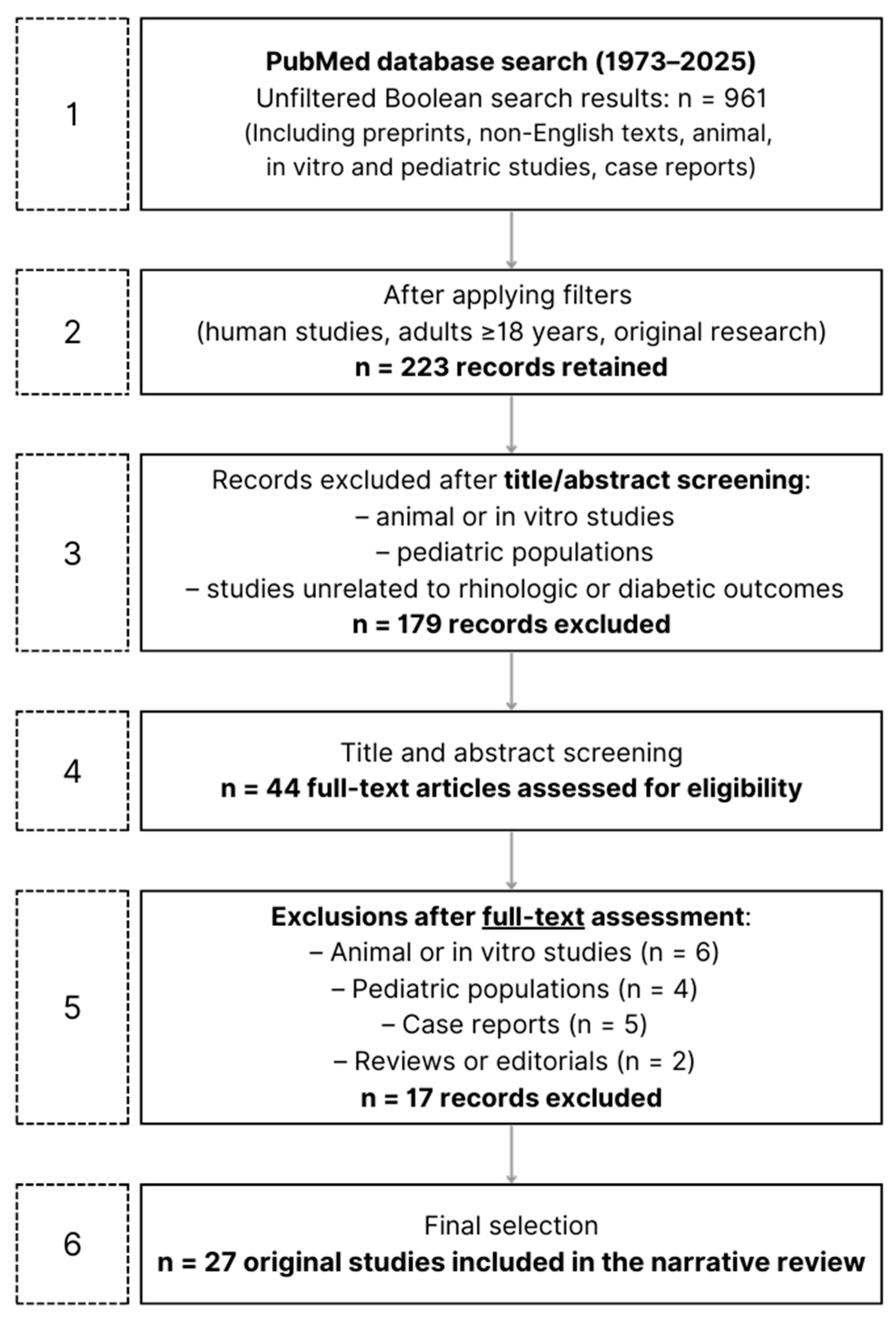 Chicago/Turabian StylePassali, Giulio Cesare, Mariaconsiglia Santantonio, Desiderio Passali, and Francesco Maria Passali. 2026. "The Diabetic Nose: A Narrative Review of Rhinologic Involvement in Diabetes (1973–2025)" Journal of Clinical Medicine 15, no. 2: 472. https://doi.org/10.3390/jcm15020472