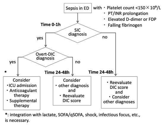 Early ED coagulation panel within 1 h, including platelet count, PT/INR, for the diagnosis of SIC and used for risk stratification and ICU triage. The tests should be repeated at 24–48 h for evolving cases. For patients who fulfilled SIC, the coagulation panel should be ordered early in the course of evaluation to confirm DIC. This includes a complete blood count with platelet count, PT-INR, fibrinogen concentration, and fibrin-related markers such as D-dimer or FDP [11,22,23,41]. Together, these readily available tests enable the early identification of sepsis-associated coagulopathy and the progression to DIC. Although full coagulation testing with repeat sampling in high-risk infection sources is ideal, it is understandable that recommendations change depending on the country’s situation. It is also recommended that SIC (and, when data permit, DIC) scoring be calculated as soon as core labs return, ideally within the first ED evaluation window, and reassessed serially when the illness is evolving, or initial results are borderline. Importantly, such testing is already endorsed in multiple national and international DIC guidelines and can typically be incorporated into routine sepsis blood panels without incurring high additional costs, delays, or logistical burdens in the ED setting [6,7,8].