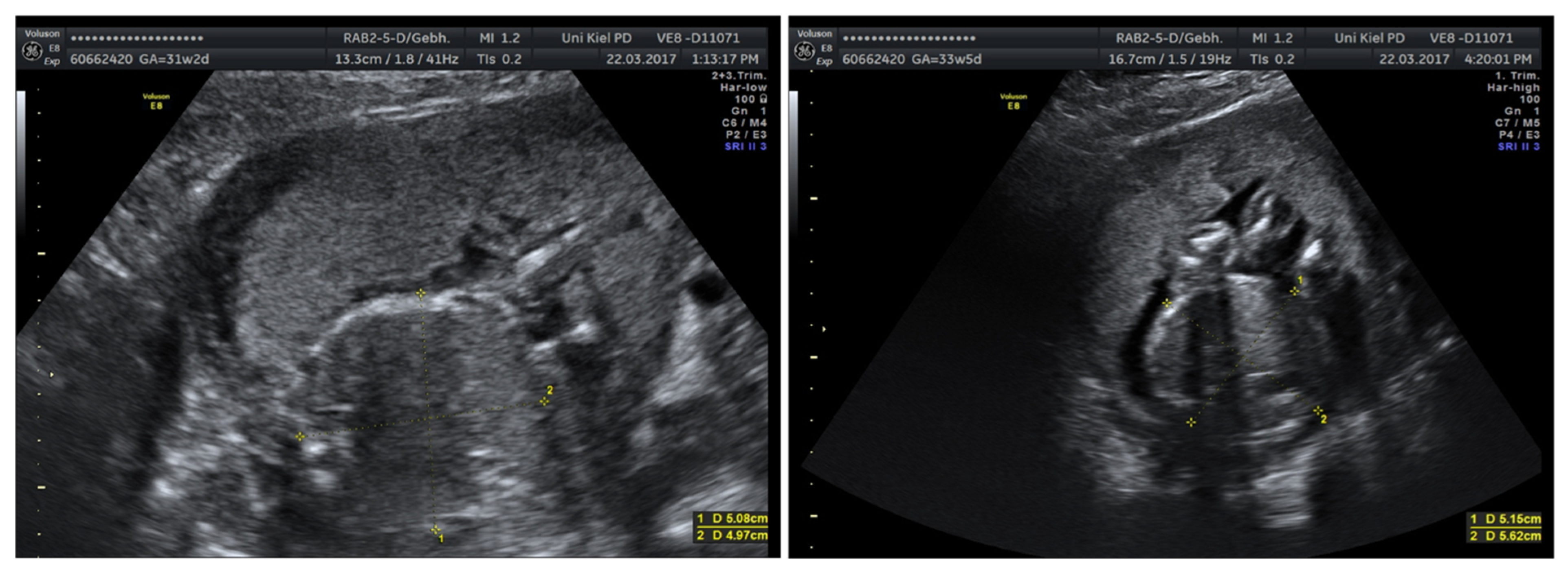 - Gembruch, U.; Hansmann, M. Artificial instillation of amniotic fluid as a new technique for the diagnostic evaluation of cases of oligohydramnios. Prenat. Diagn. 1988, 8, 33–45. [Google Scholar] [CrossRef]