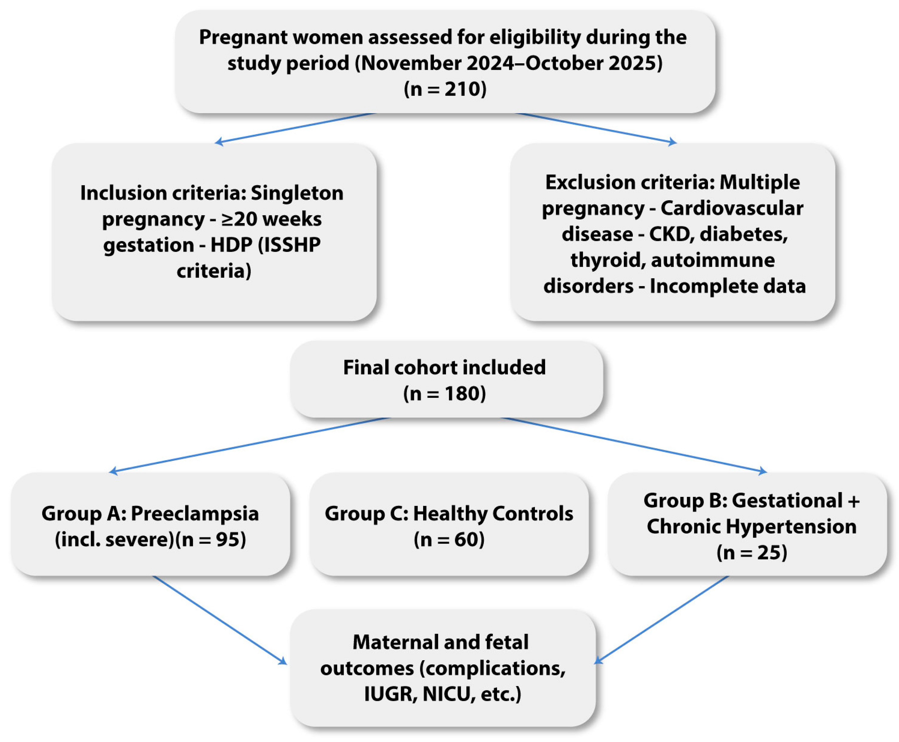 | Variable | Group A: PE (n = 95) | Group B: GH + CH (n = 25) | Group C: Healthy Controls (n = 60) | p-Value |