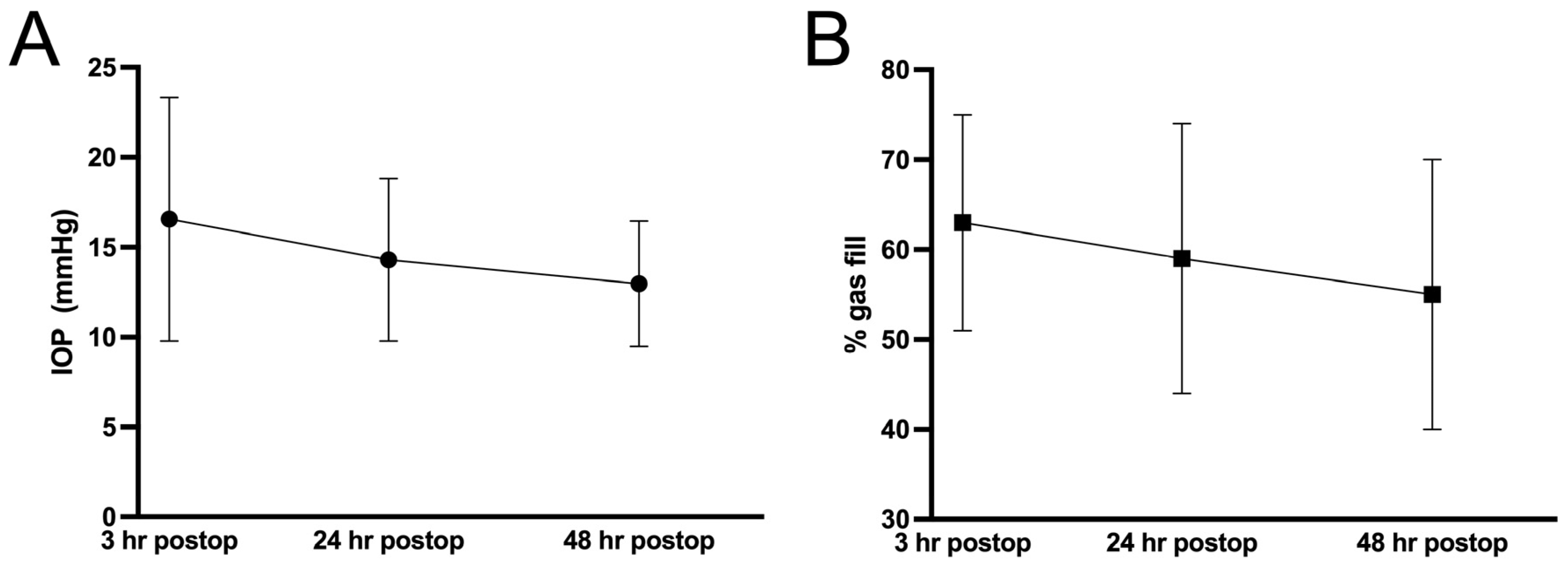 Mean IOP and anterior chamber gas fill were recorded at three time points postoperatively. At 3 h, the mean IOP was 16.6 ± 6.8 mmHg, and the mean gas fill was 63 ± 12%. At 24 h, the mean IOP had decreased to 14.3 ± 4.5 mmHg, and gas fill was 59 ± 15%. At 48 h, the mean IOP further declined to 13.0 ± 3.5 mmHg, and gas fill was measured at 55 ± 15% (