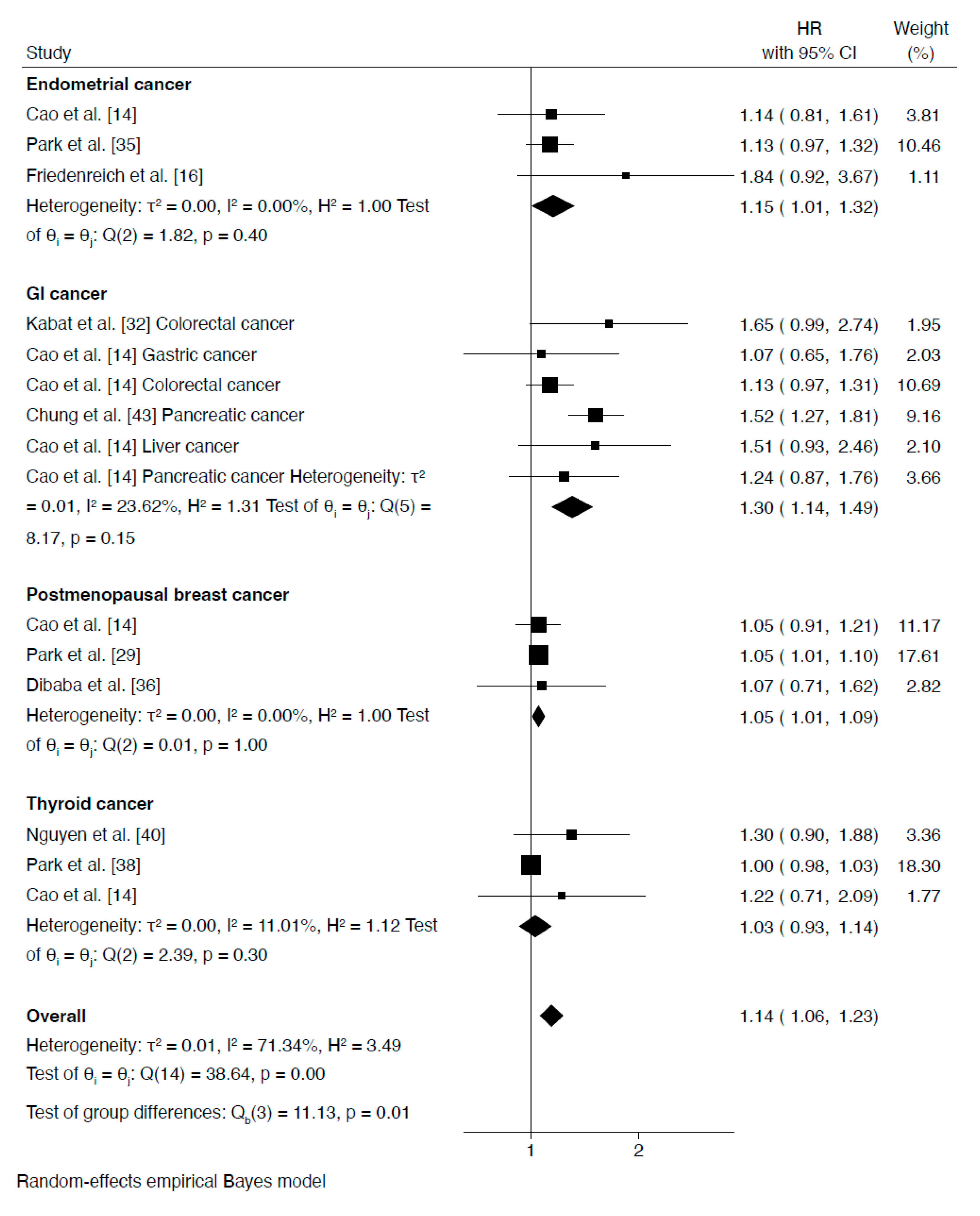 | Dibaba et al. [36] | USA | 14 | 43,546 (43,546) | NR | BMI < 25 kg/m2 | Presence of at least 3 metabolic factors, including: (1) high WC > 88 cm for women, (2) dyslipidemia or self-reported history of elevated cholesterol level, (3) high BP or self-reported history of hypertension, and (4) self-reported history of diabetes | Breast cancer | Age, race, BMI, education, region, physical activity, smoking, marital status, family history of breast cancer, ovary status, hysterectomy, hormonal therapy use, and ovary status BMI interaction |