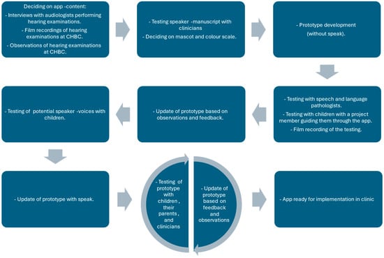 In Denmark, children’s hospital experiences are increasingly recognized as an important indicator of healthcare quality. This is particularly reflected in large investments in new departments and hospital buildings designed especially for children and their families [21]. Other initiatives supporting children’s right to information, decision-making, and play are also emerging. In 2023, the rehabilitation method Auditory Verbal Therapy (AVT) was implemented nationally as a government funded offer to all children with hearing loss [22]. The central part of AVT is playful learning, and trained AVT-specialists use play in guiding parents to support their child’s listening and spoken language development [22]. Since children with hearing loss require life-long monitoring and treatment, audiological departments have a responsibility to offer playful testing, training, and treatment to create positive hospital experiences. In line with this, an audiology department in Denmark has explored the use of game-based apps to provide information about hearing loss to adolescents and parents. Evaluations are positive, showing that both virtual reality and tablet-based apps can be effective in creating positive awareness and knowledge of hearing loss [14,23]. The purpose of the current project is to broaden and optimize the child-friendly approach at the department with a specific focus on preparing the youngest patients for hearing examination with a game-based app.