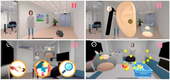 The app was designed around three key elements, identified through the initial interviews with audiologists as particularly challenging or intimidating for young children undergoing hearing examinations: (1) the soundbox where the hearing examination is performed, (2) the white smocks that audiologists wear, and (3) clinicians touching the ears of the child. This final element was considered particularly important since otoscopy, objective measures, and the use of insert earphones to obtain ear-specific information of the hearing test, require clinicians to touch the ears of the child. The environment in the app was made as realistic as possible, with a slight cartoonish stylization (to avoid the uncanny valley), preparing children for the soundbox and audiologists in white smocks; the storyline resembles the real-life procedures with otoscopy, objective measurements, and hearing tests.