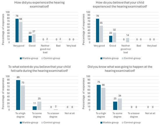 Parents’ and children’s experiences of hearing examinations. Although differences between groups are visually apparent in the figure, these differences were not subjected to formal statistical testing and should be interpreted descriptively.