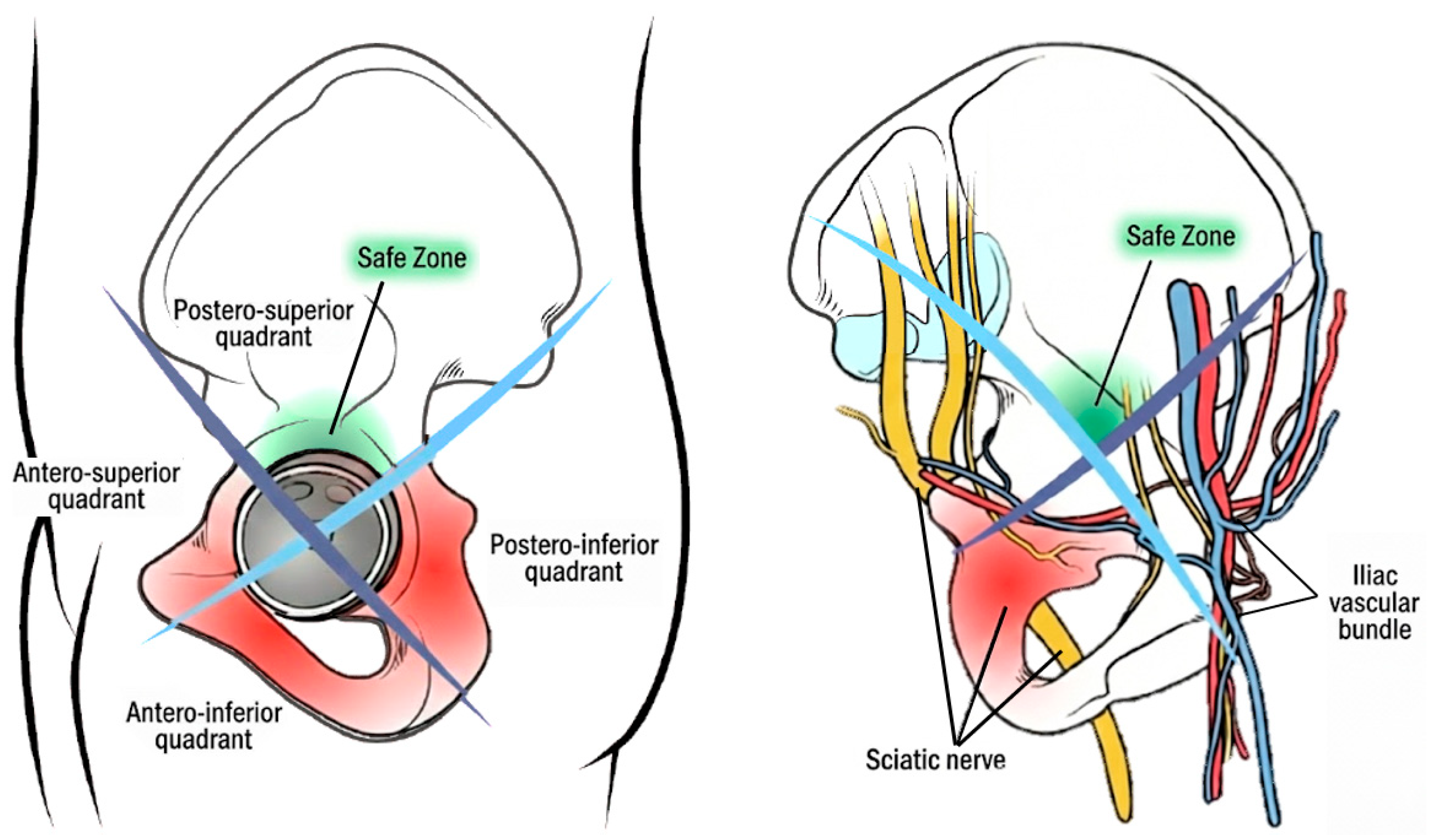 - Revision total hip arthroplasty (rTHA): This is a significant risk factor for the development of a nerve injury compared to primary THA. The incidence of nerve injury in revision THA is considerably higher, with studies reporting rates as high as 7.6%, compared with 0.6–3.7% in primary procedures [12,16,17]. This increased risk is largely attributed to the complex surgical environment encountered during rTHAs, in which the presence of an altered local anatomy and scar tissue surrounding nerves, compromising their blood supply, make the nerves more vulnerable to traction [12,16,17]. Moreover, a larger postoperative hematoma is typically related to rTHA because of wider surgical exposure and soft tissue severance [8,24,28]. Additionally, these procedures usually last longer compared to primary THAs, and time is an independent risk factor for neural injury. Finally, the use of screws in atypical Wasielewski zones exposes the patient to an increased risk of neural injury because of the potential direct conflict with the tip of the screw [12,16,17], which is more common in revision cases compared to primary THAs [34] (Figure 2).