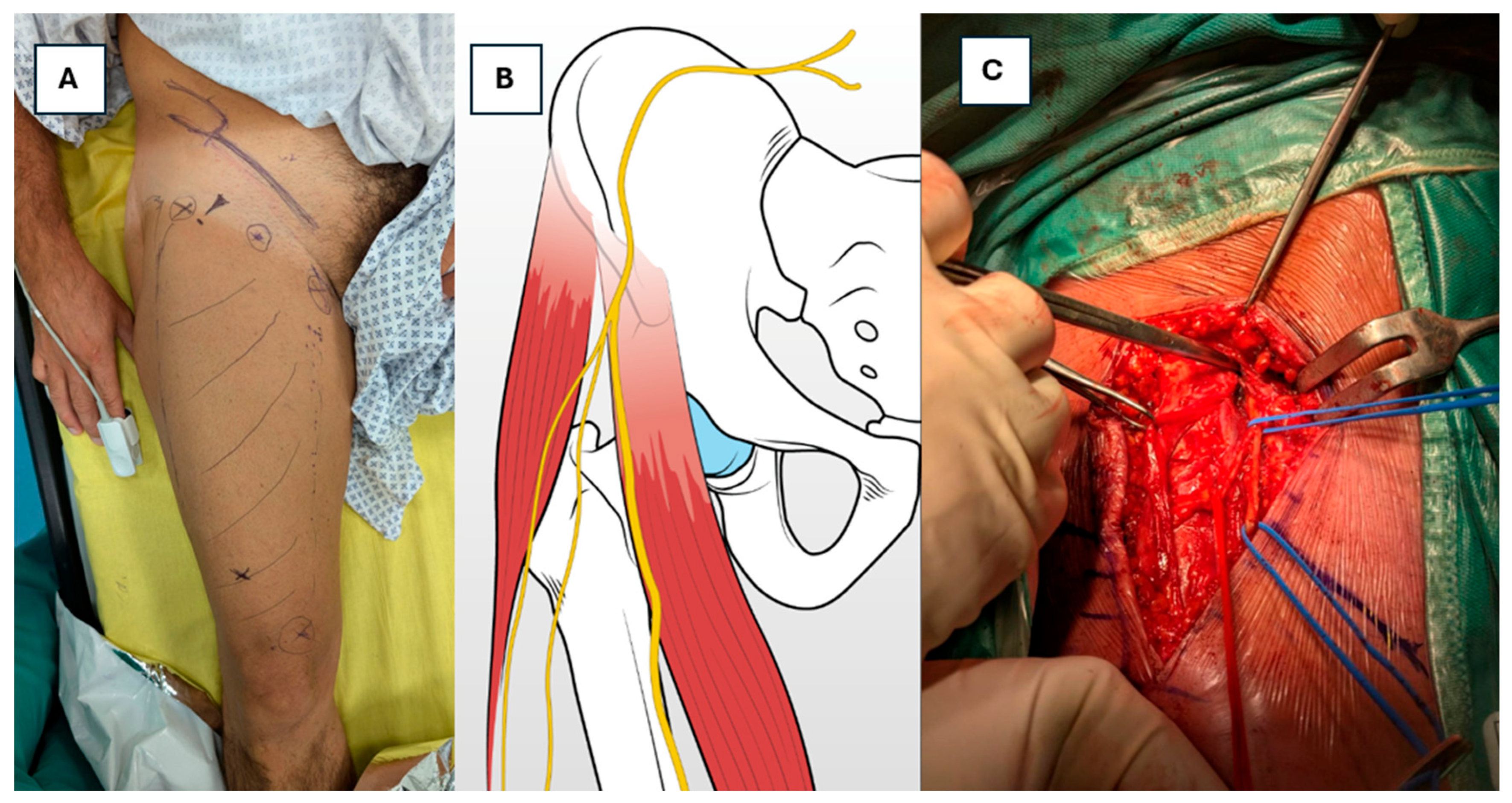 - Patient Positioning: Proper positioning of the patient on the operating table may contribute to a decrease in excessive traction, flexion, extension, rotation, or compression to critical regions (lateral thigh, ischial tuberosity, and fibular head) [21,24]. Tsurumi et al. [37], by analyzing the effects of leg position on femoral neurovascular bundle location using MRI, demonstrated that the external rotation and extension of the hip affects the femoral artery, vein, and nerve locations; these factors could decrease the risk of direct injury or traction on the nerves. Proper padding during patient positioning and careful alignment of the limbs can help avoid positioning-related nerve injuries. The patient should be positioned to keep neutral alignment of the hip joint; the surgical team should regularly check and adjust the patient’s position throughout the procedure to maintain optimal alignment [38]. Additionally, minimizing the time in which the patient stays in any position could further decrease the likelihood of prolonged nerve compression.