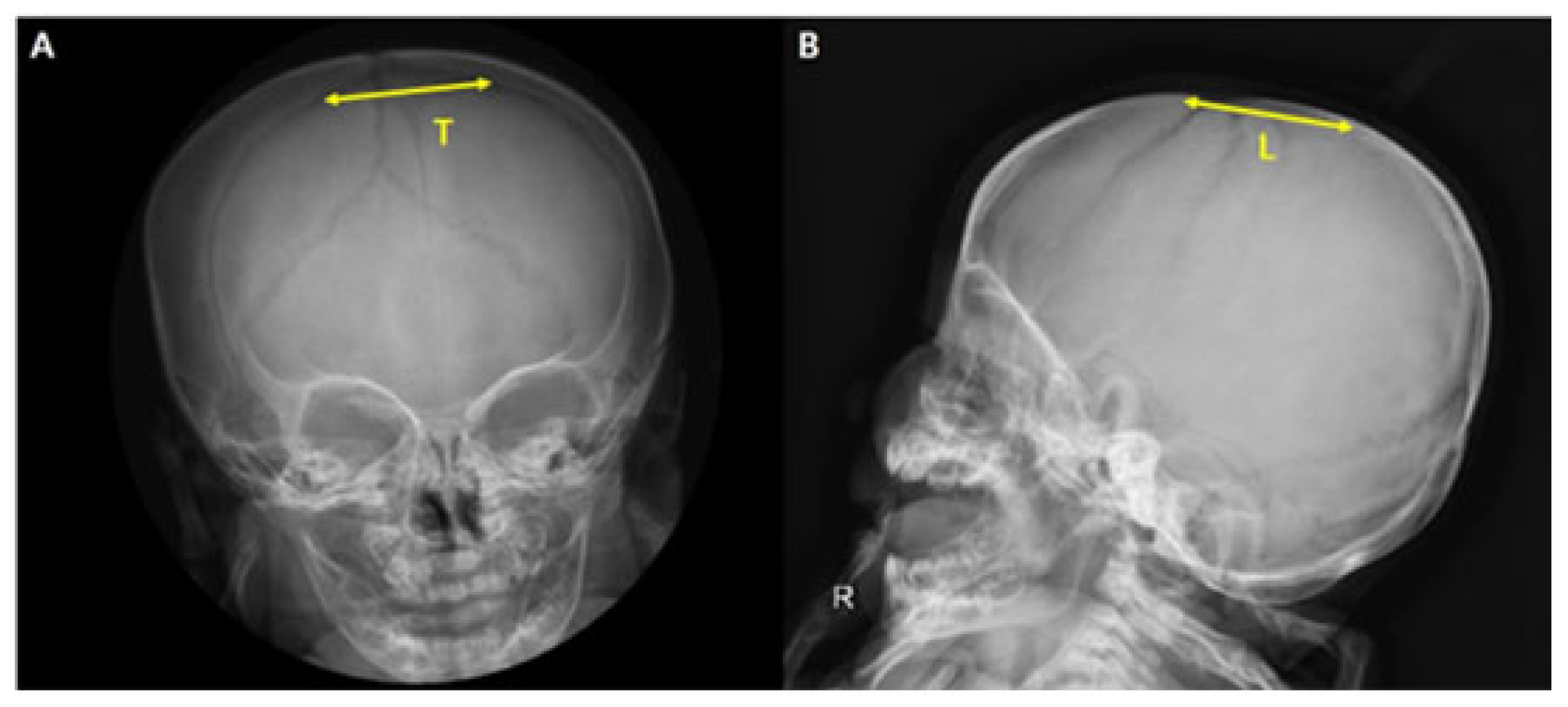- Pedroso, F.S.; Rotta, N.; Quintal, A.; Giordani, G. Evolution of Anterior Fontanel Size in Normal Infants in the First Year of Life. J. Child Neurol. 2008, 23, 1419–1423. [Google Scholar] [CrossRef] [PubMed]